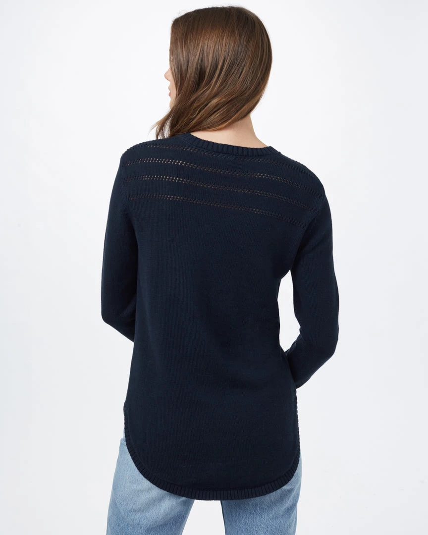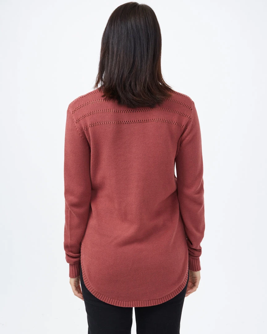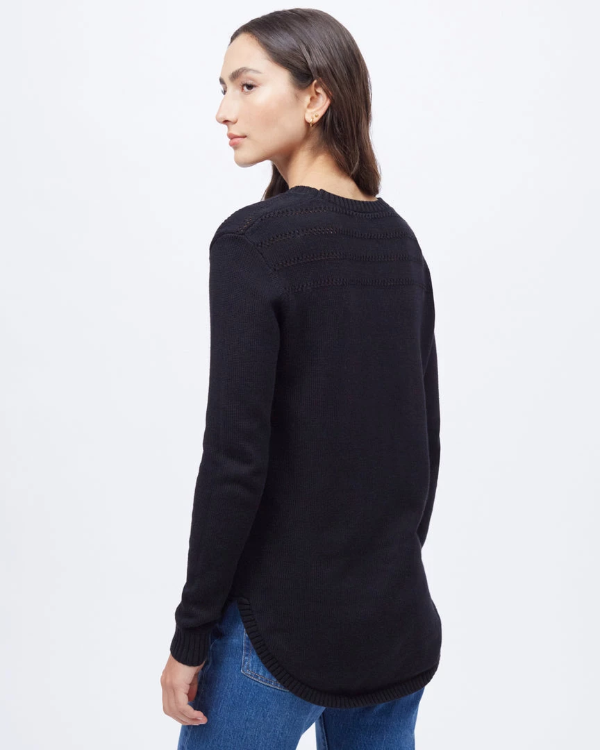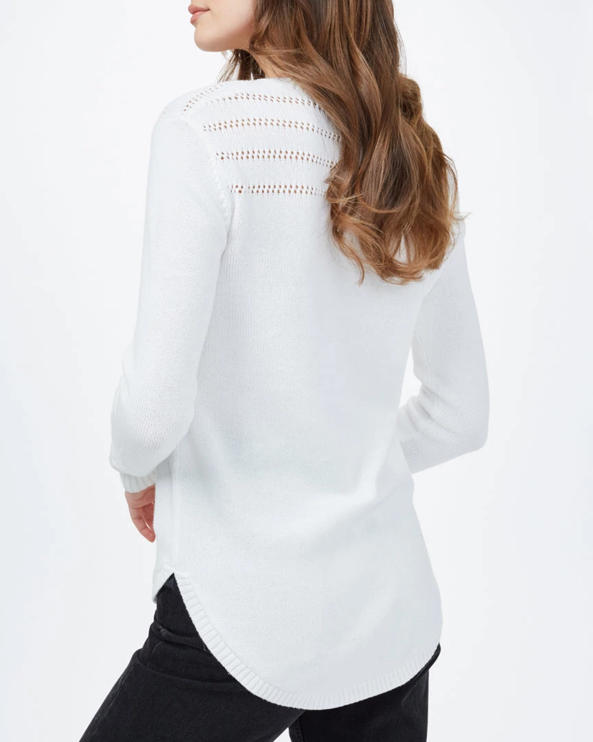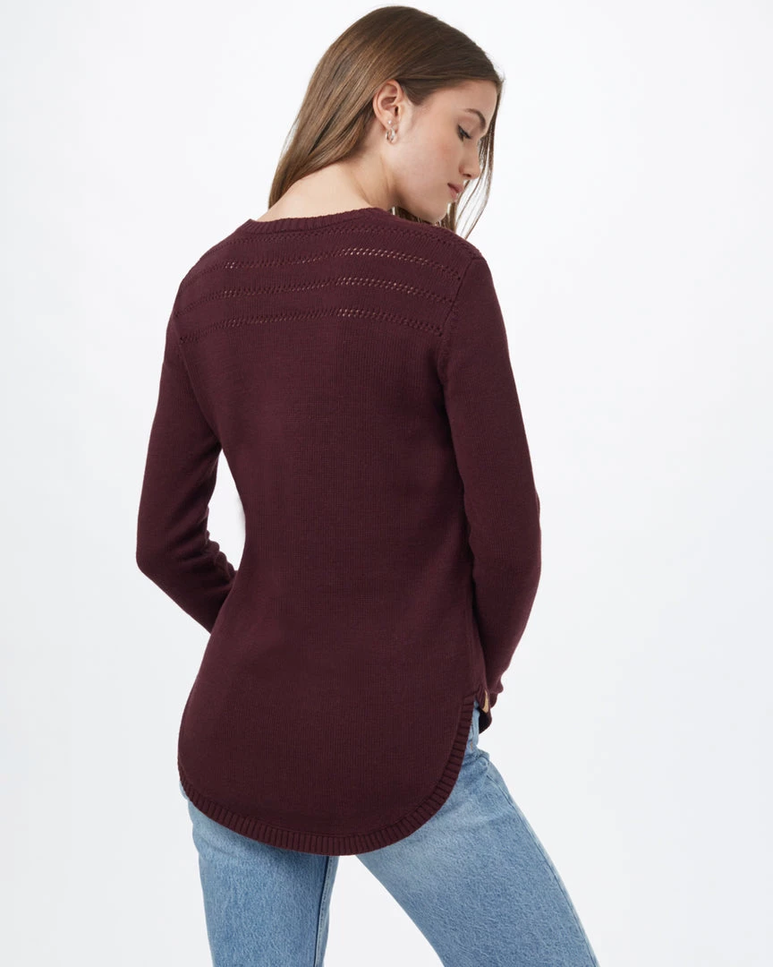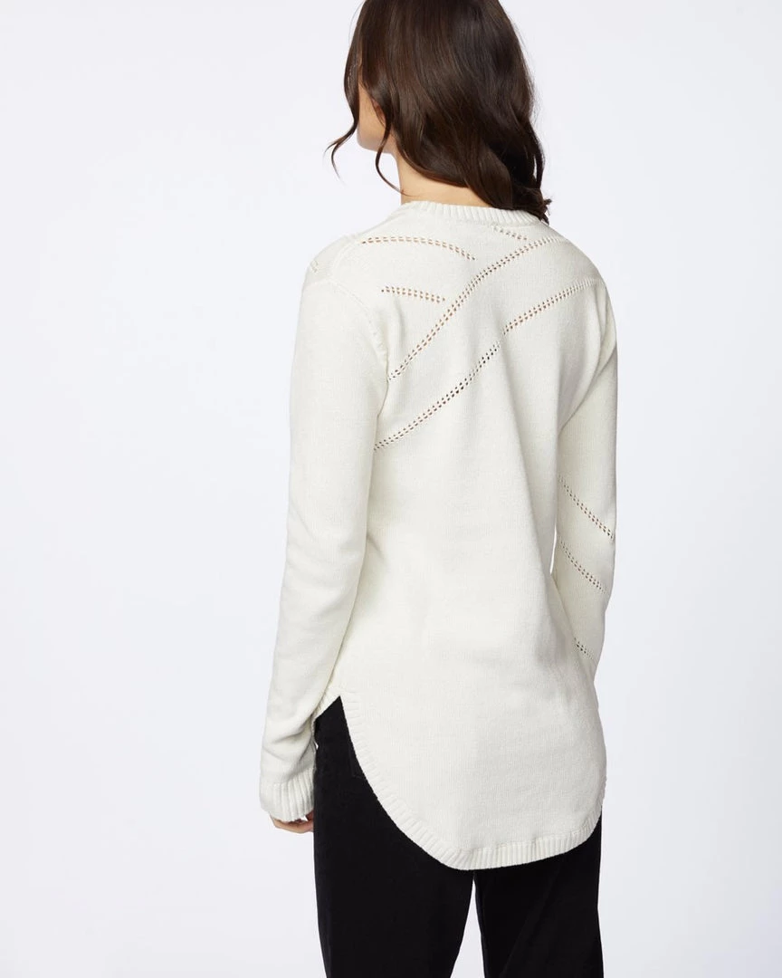 - Long sleeve knit sweater, long scoop hem, design stitching throughout