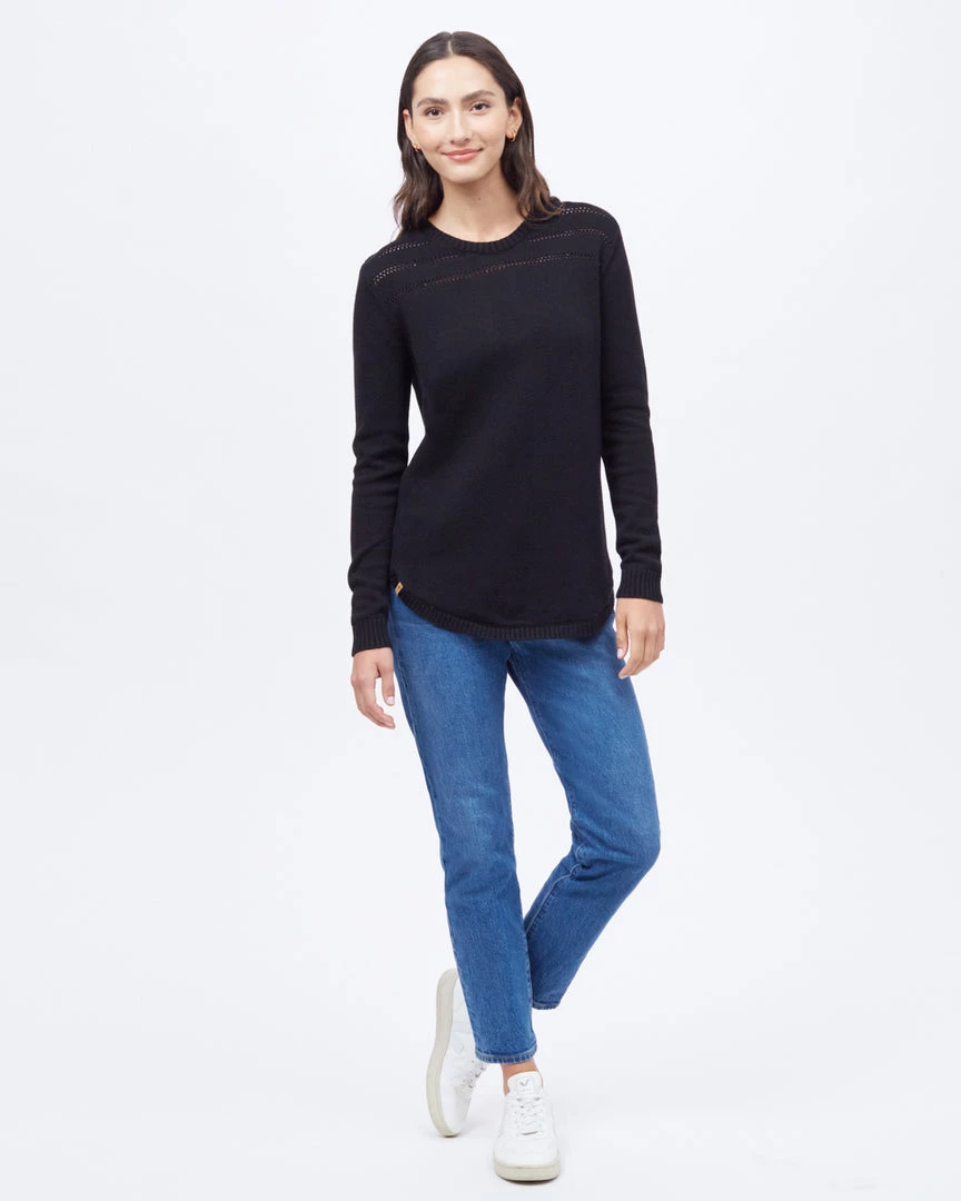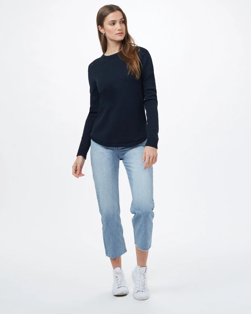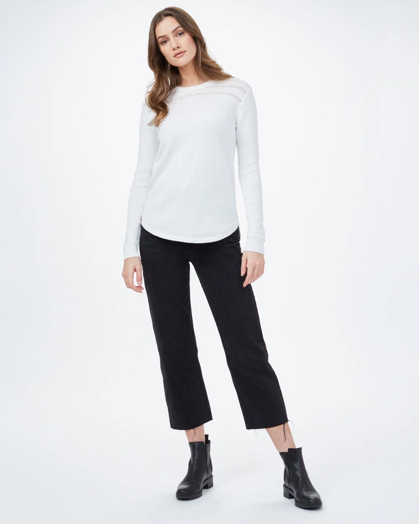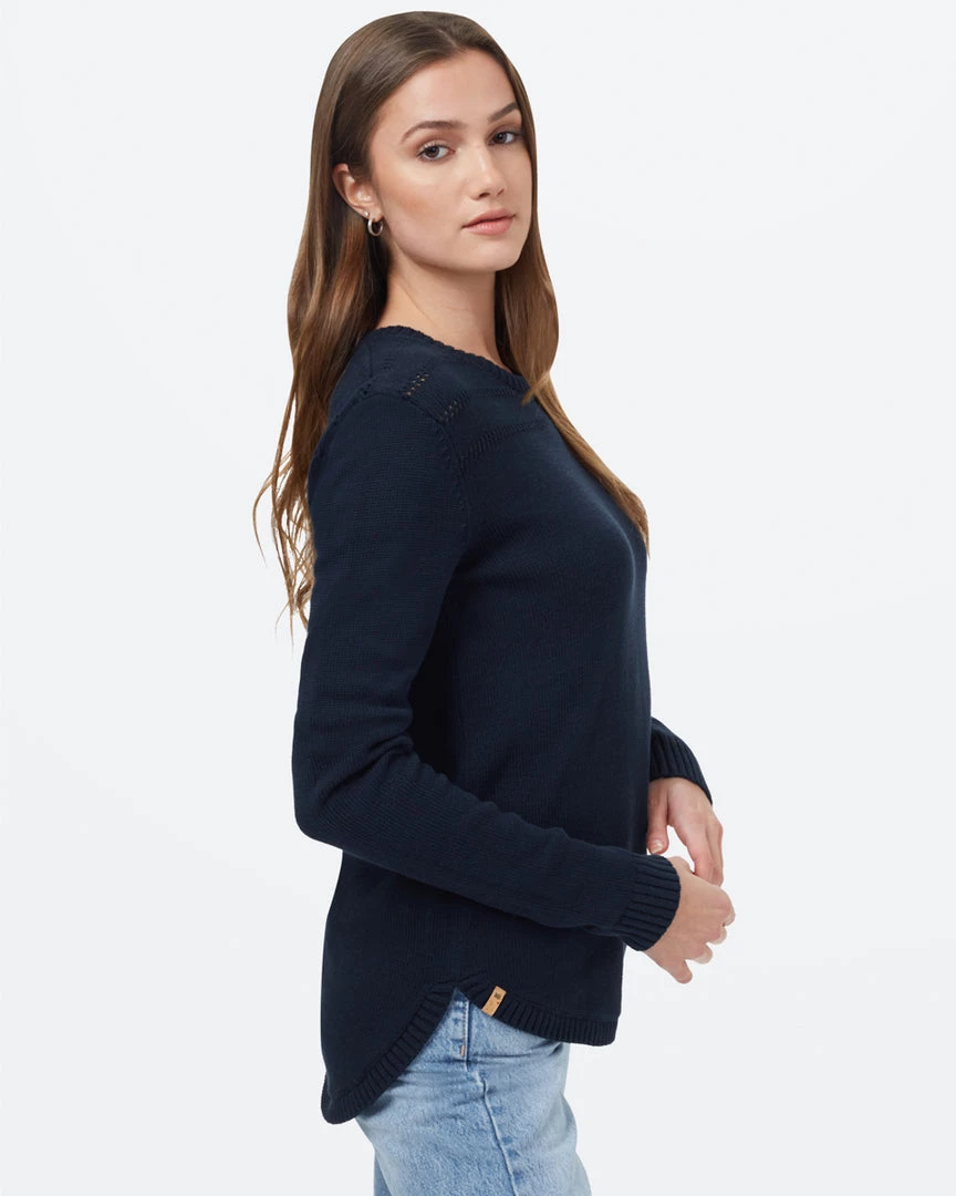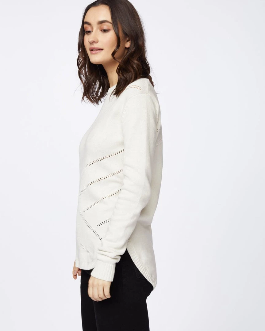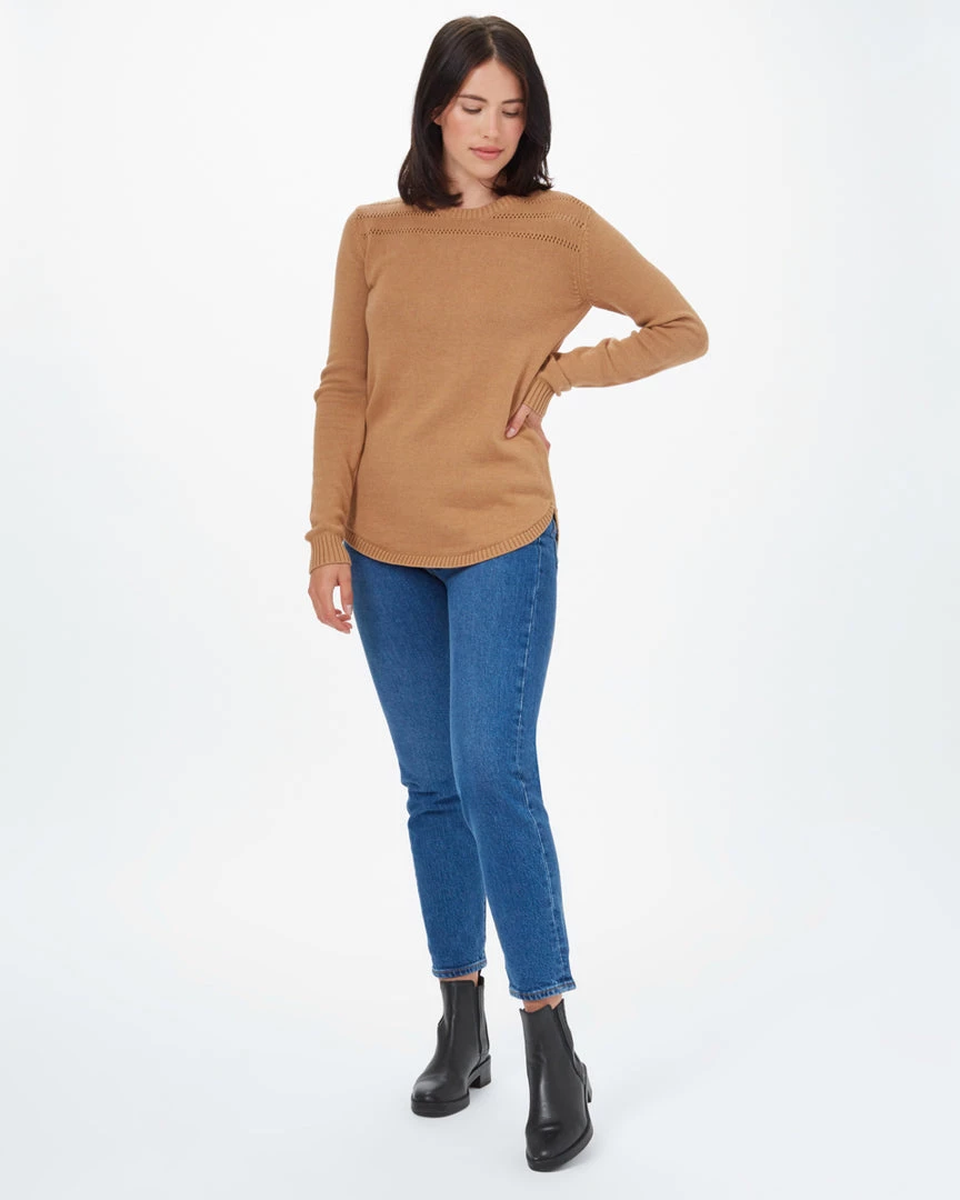 - Long sleeve knit sweater, long scoop hem, design stitching throughout