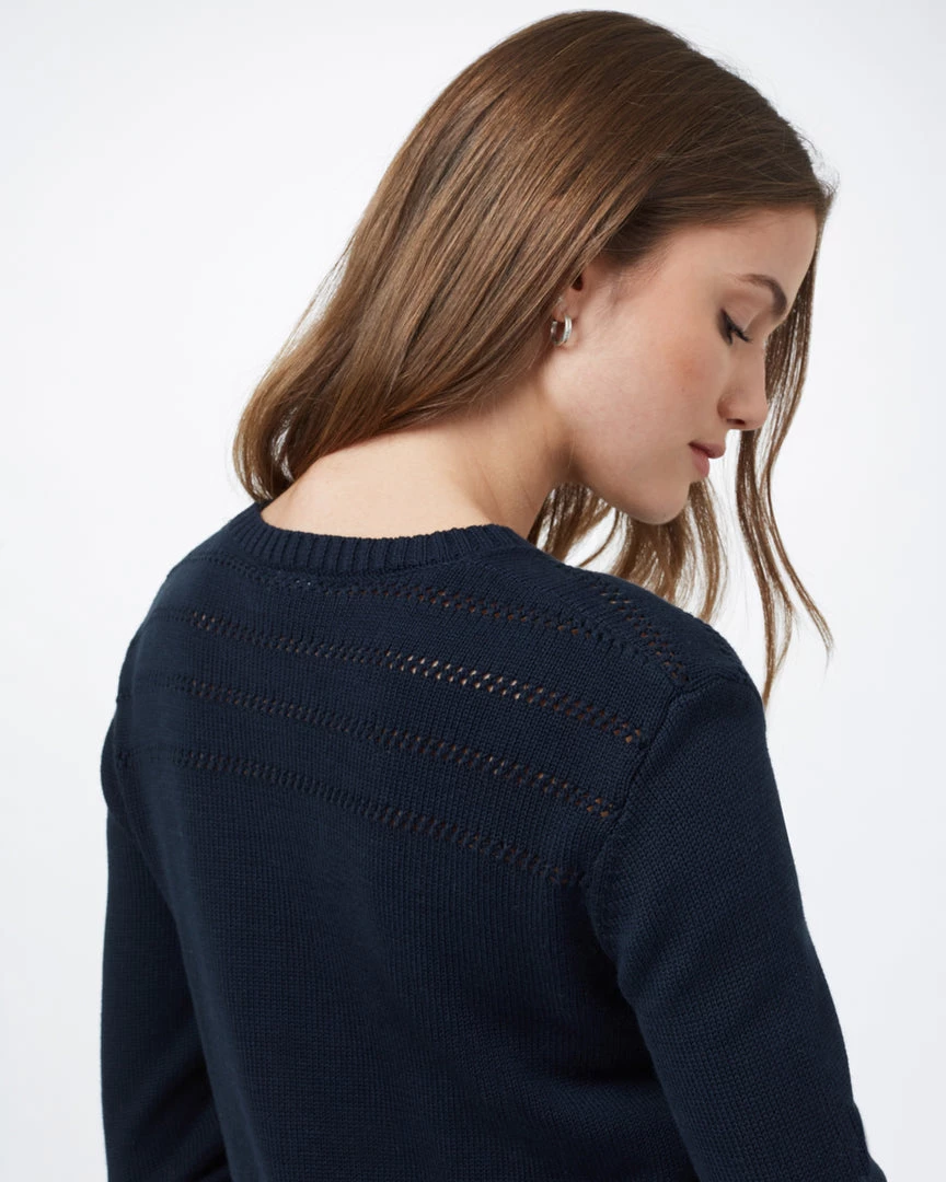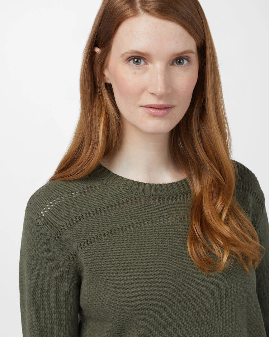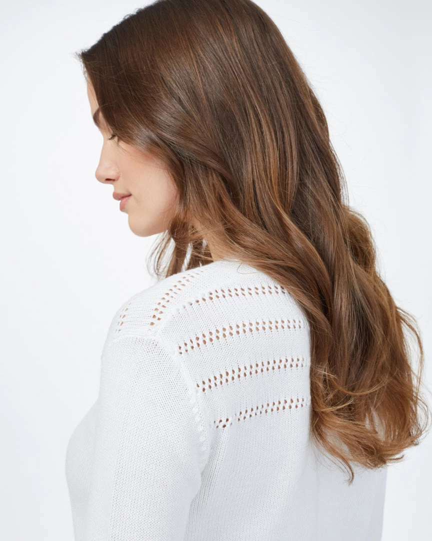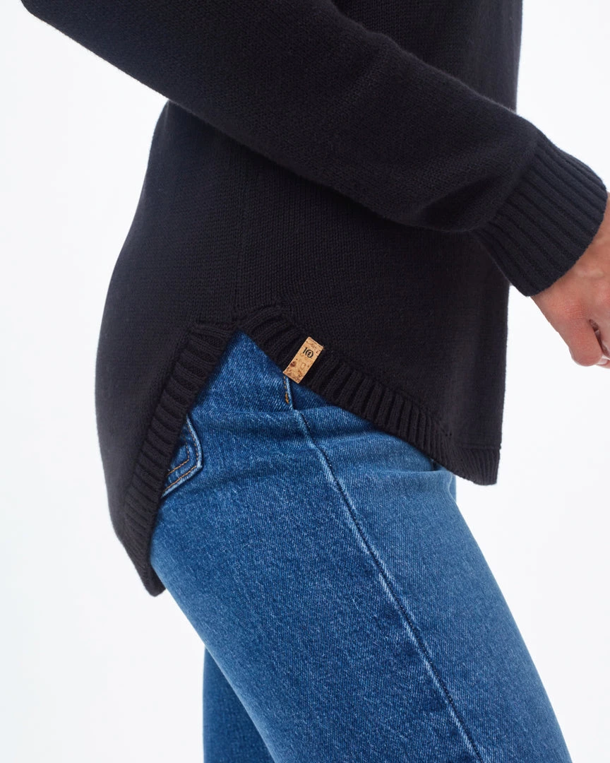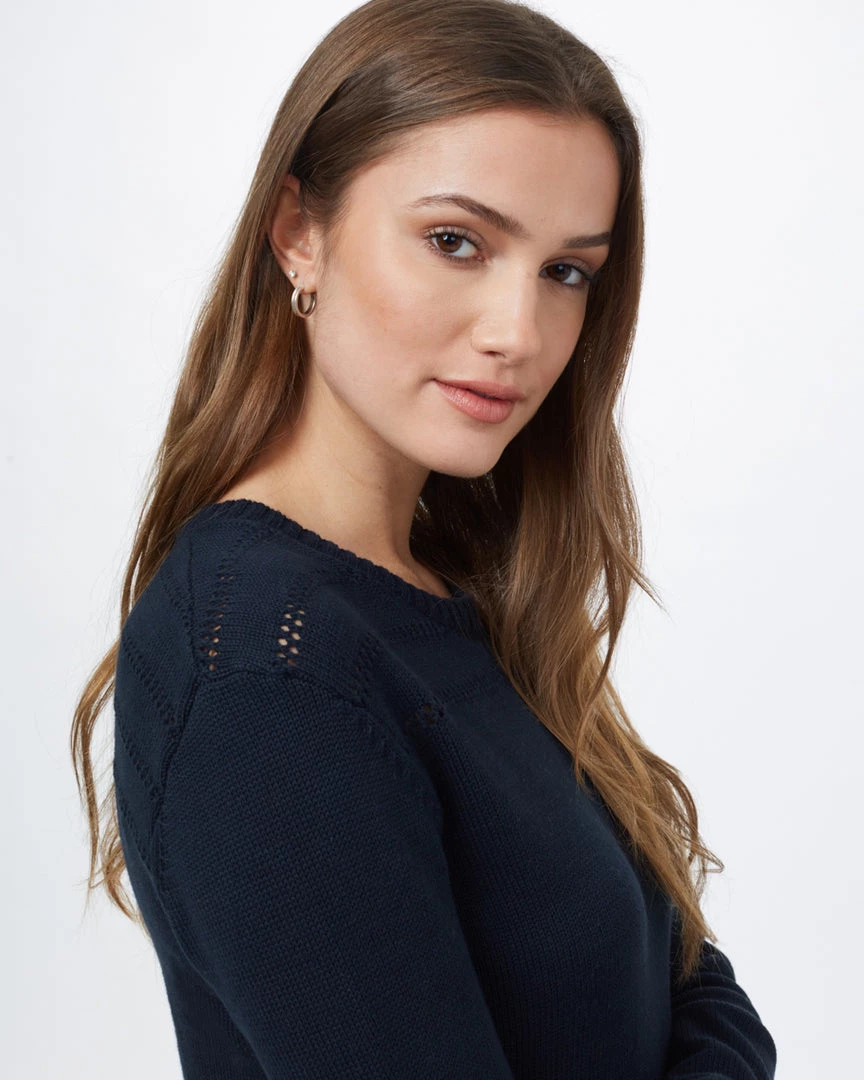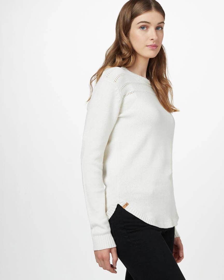 - Long sleeve knit sweater, long scoop hem, design stitching throughout