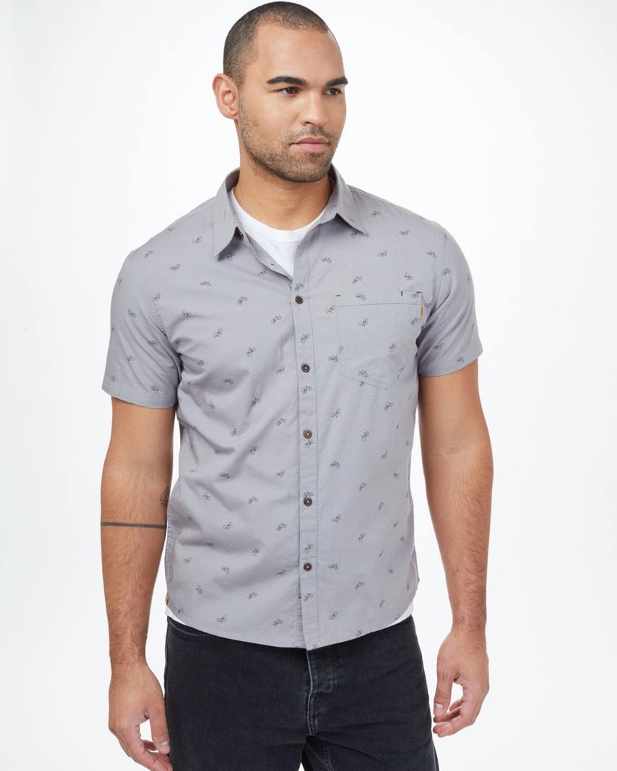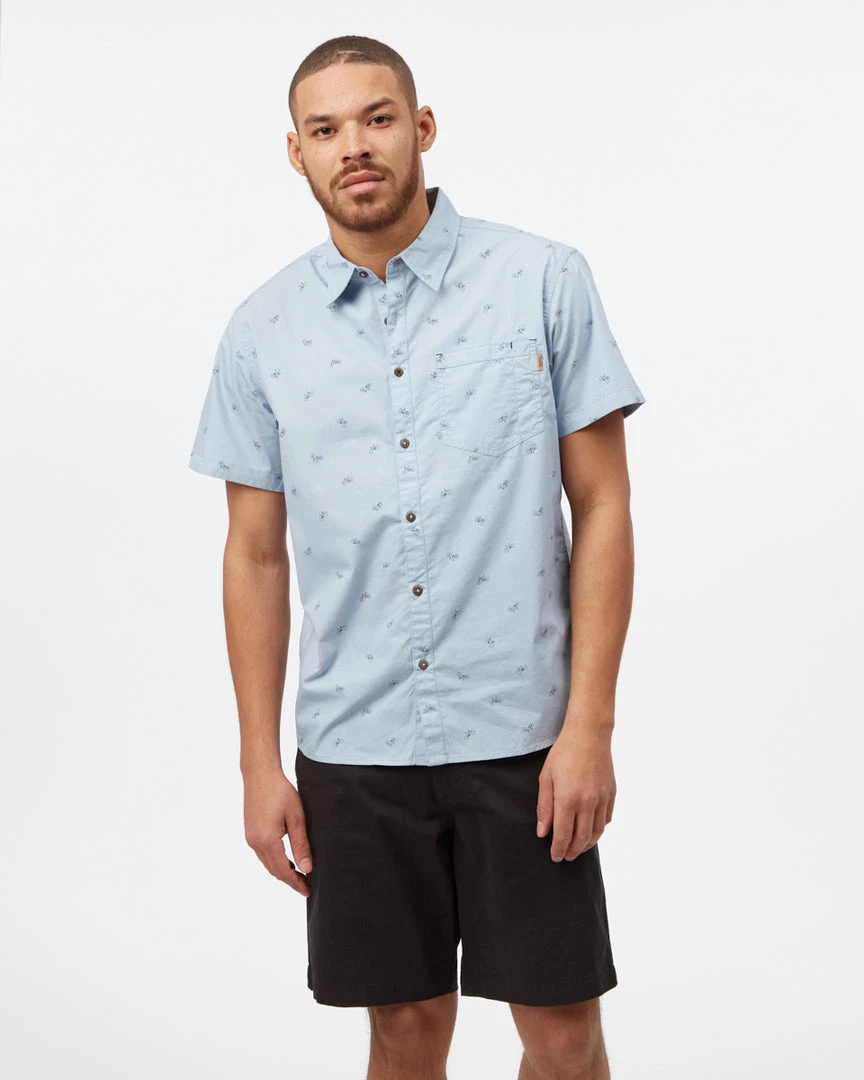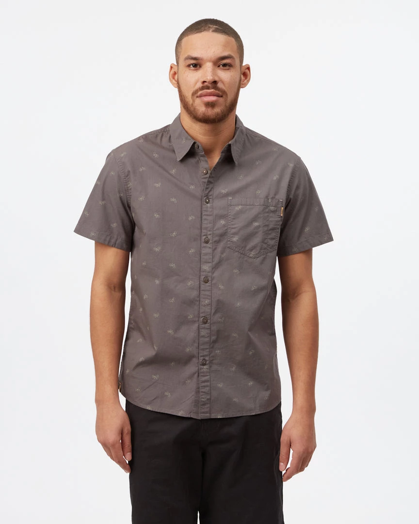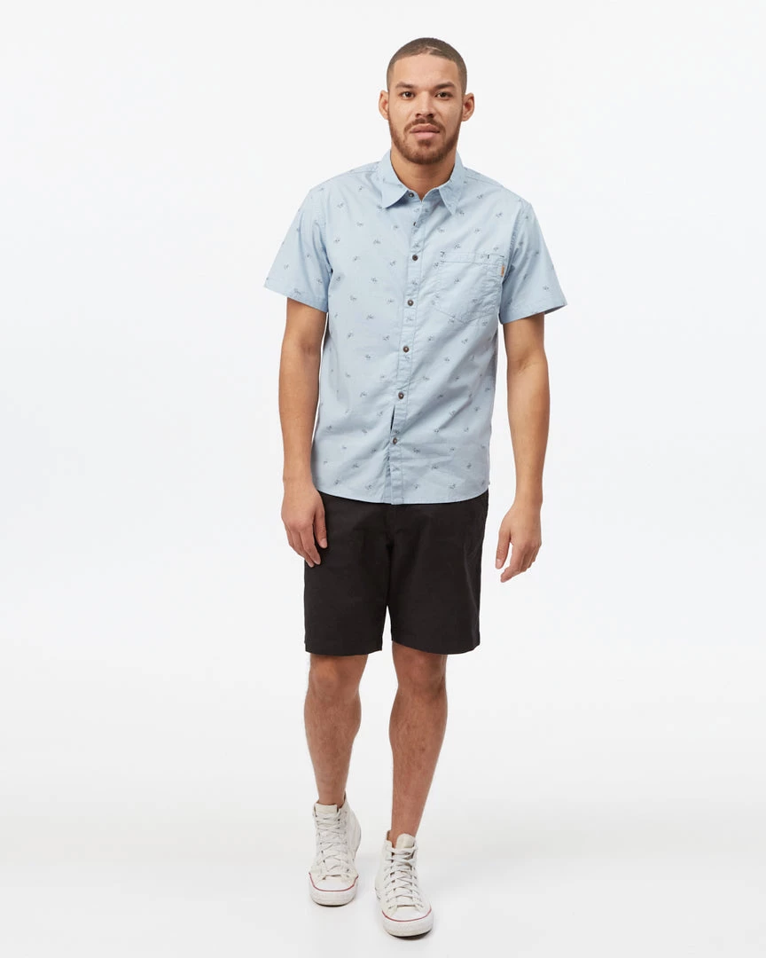 - Collared short sleeve button-down shirt, chest patch pocket, divided pocket to hold sunglasses, all-over print