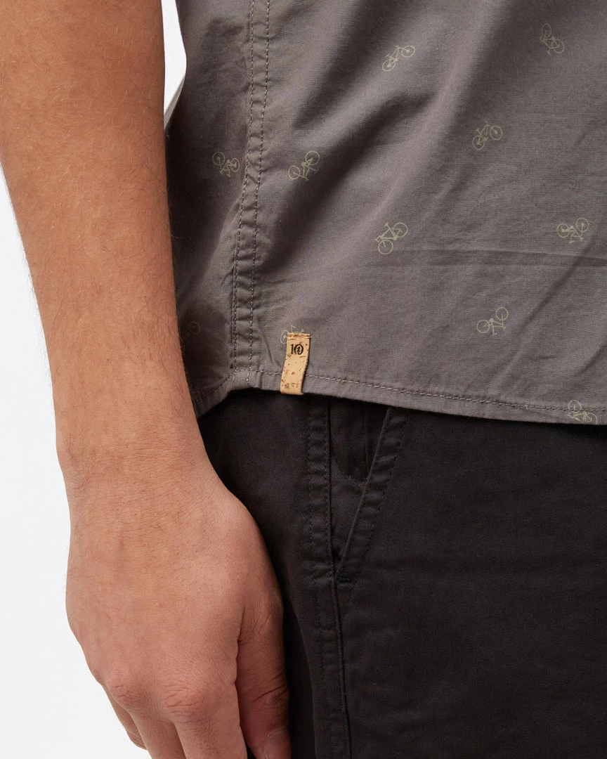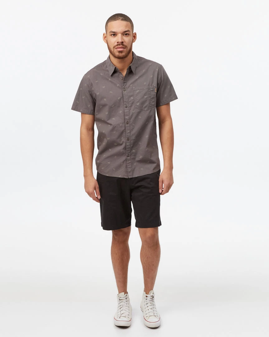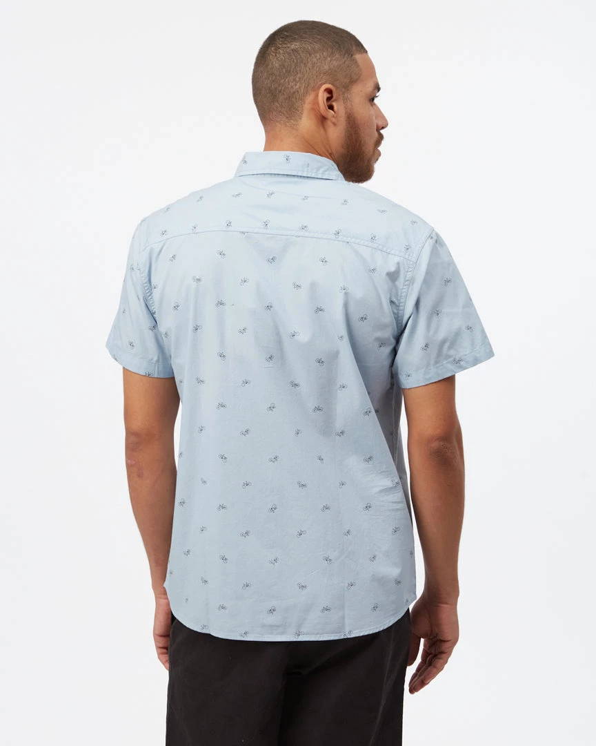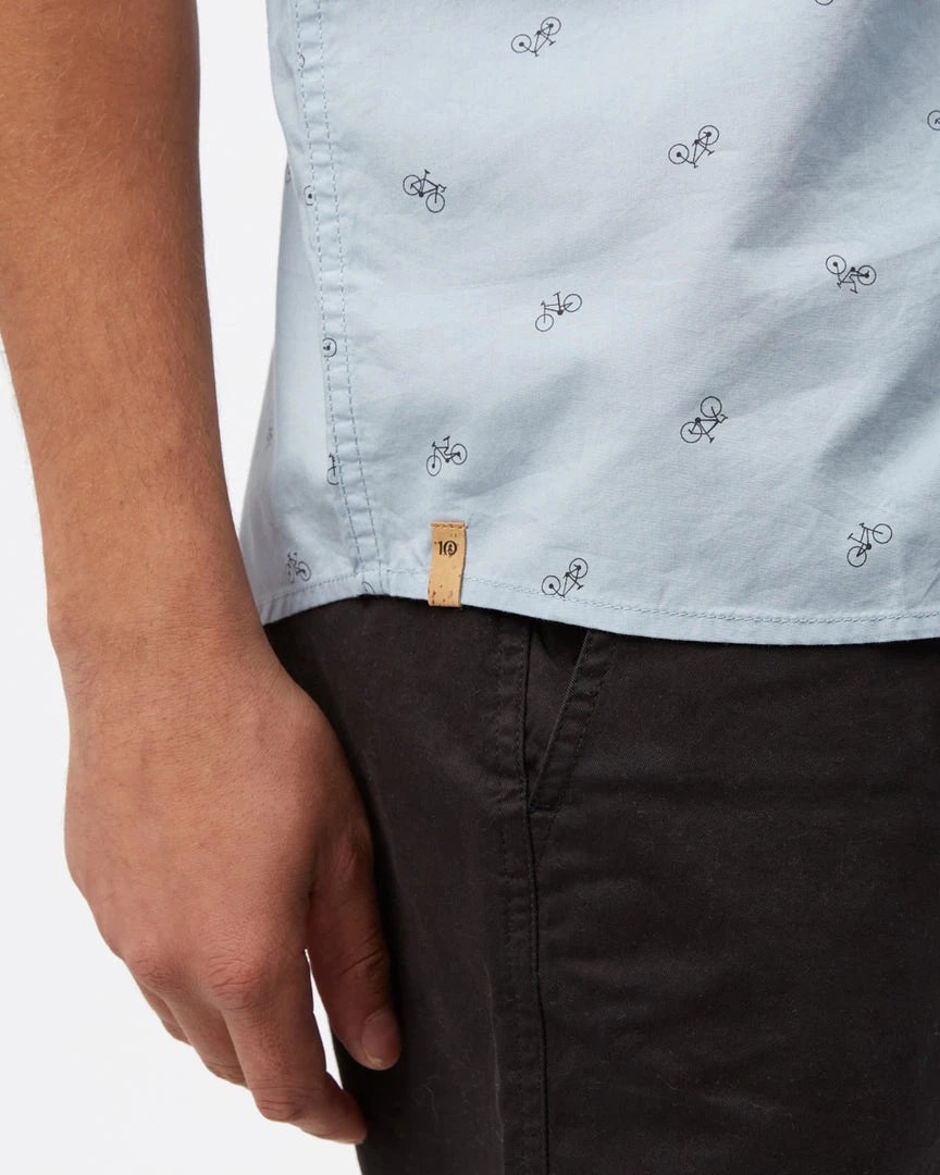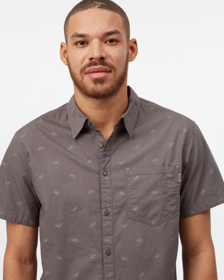 - Collared short sleeve button-down shirt, chest patch pocket, divided pocket to hold sunglasses, all-over print