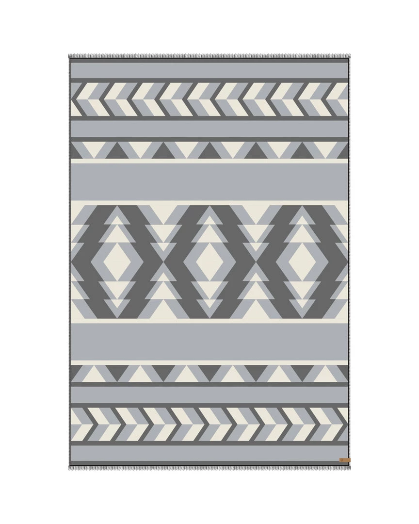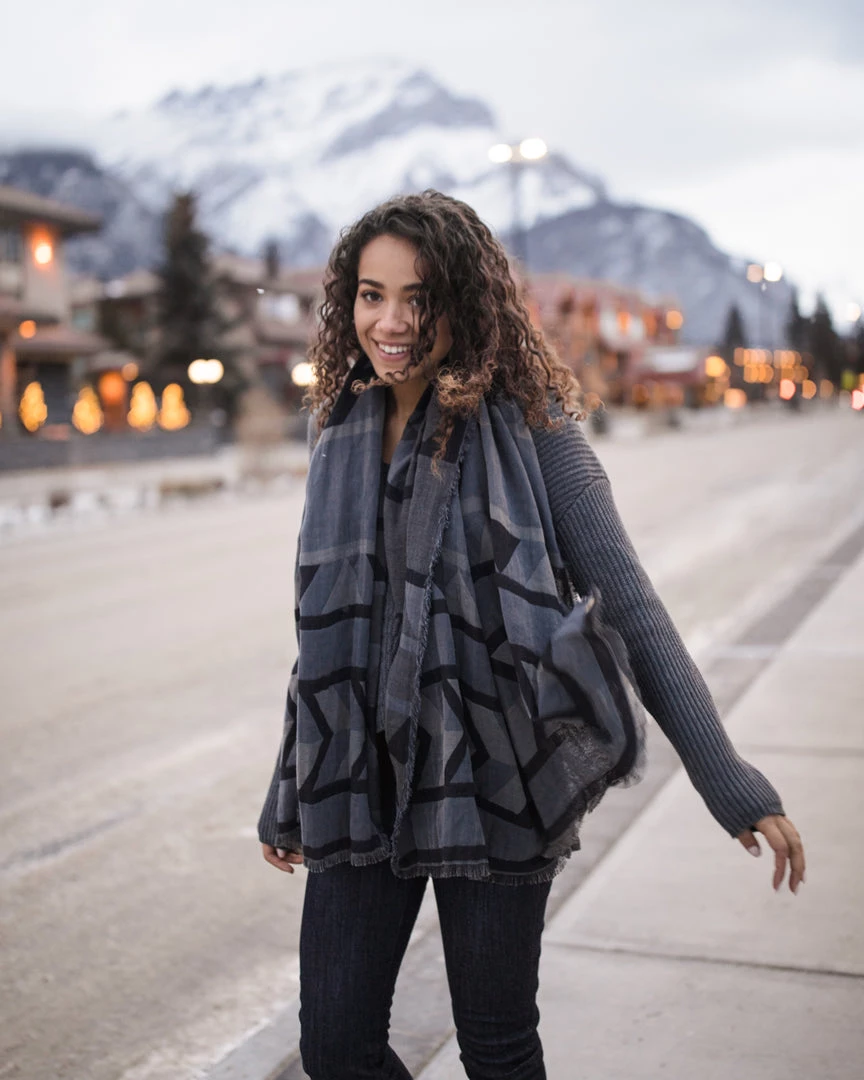 - Oversized blanket scarf, Nordic-inspired jacquard design, Dimensions: 66″ x 45″, fringed edge