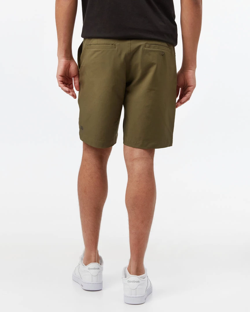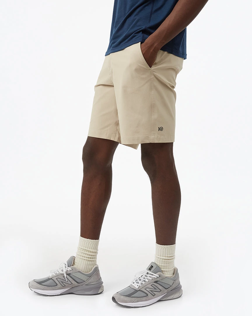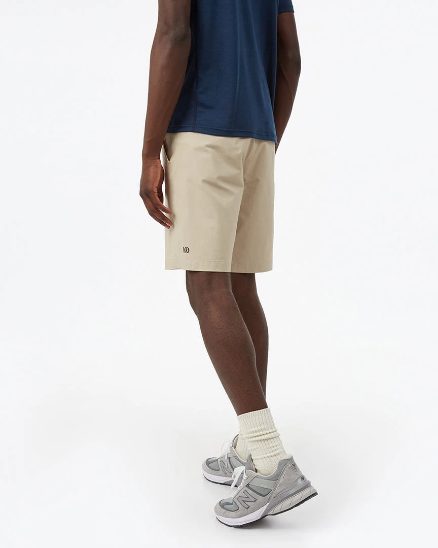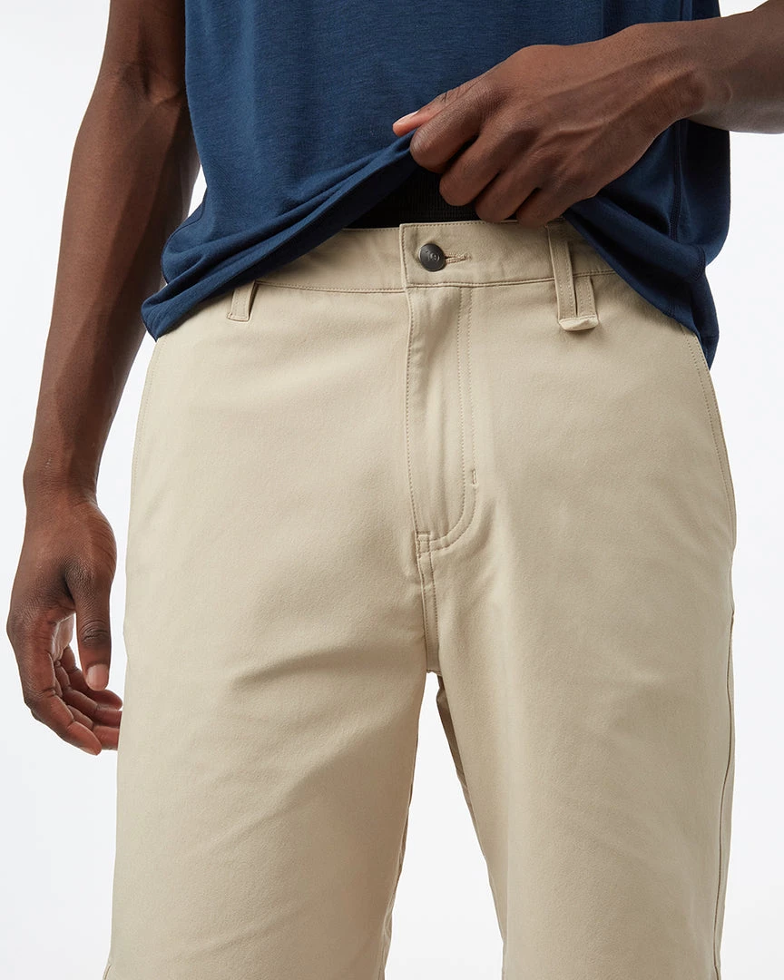 - Fixed waist shorts, front zip coin pocket, back belt pockets, 9” inseam