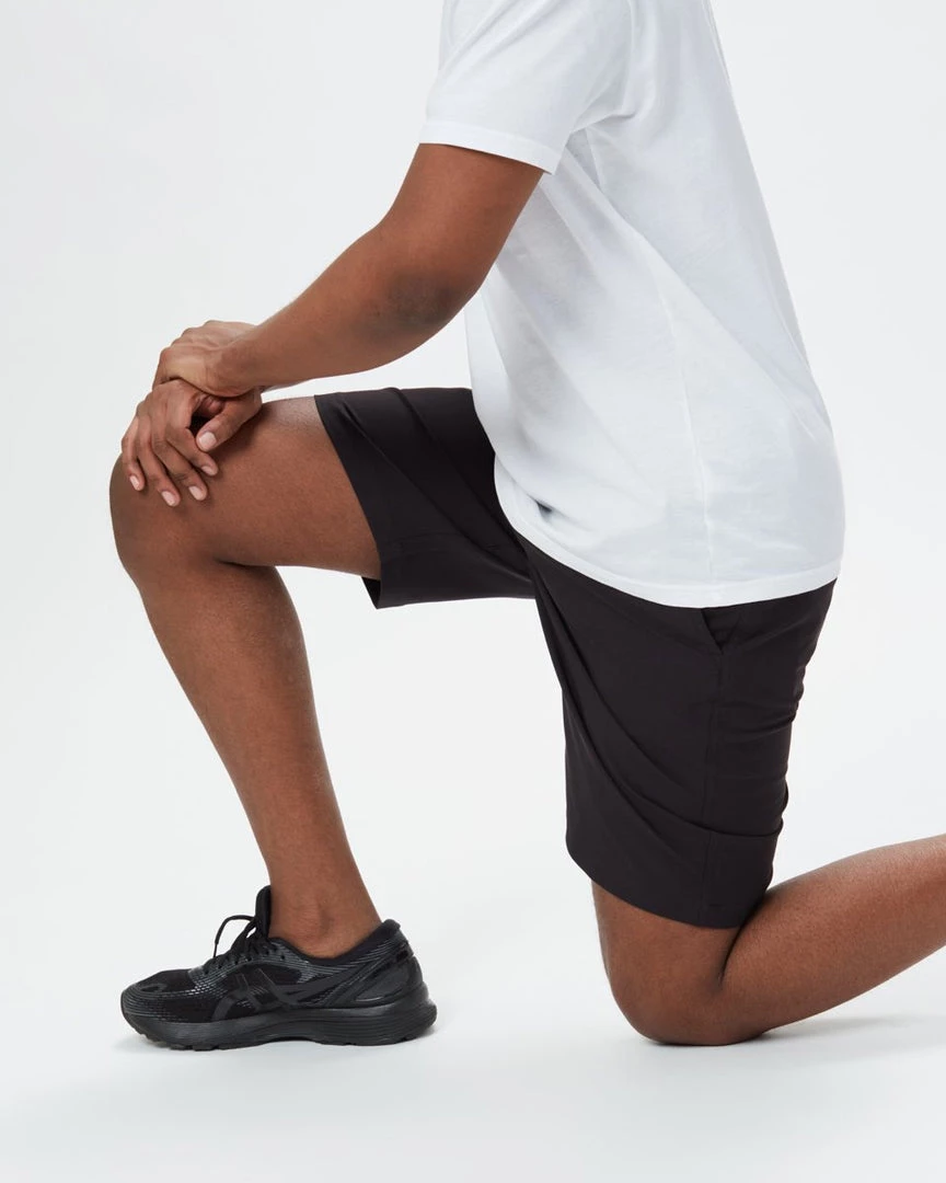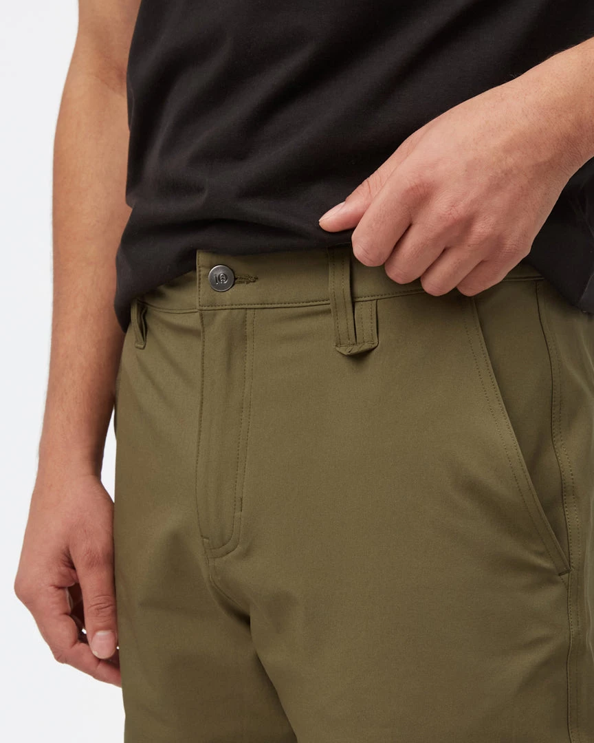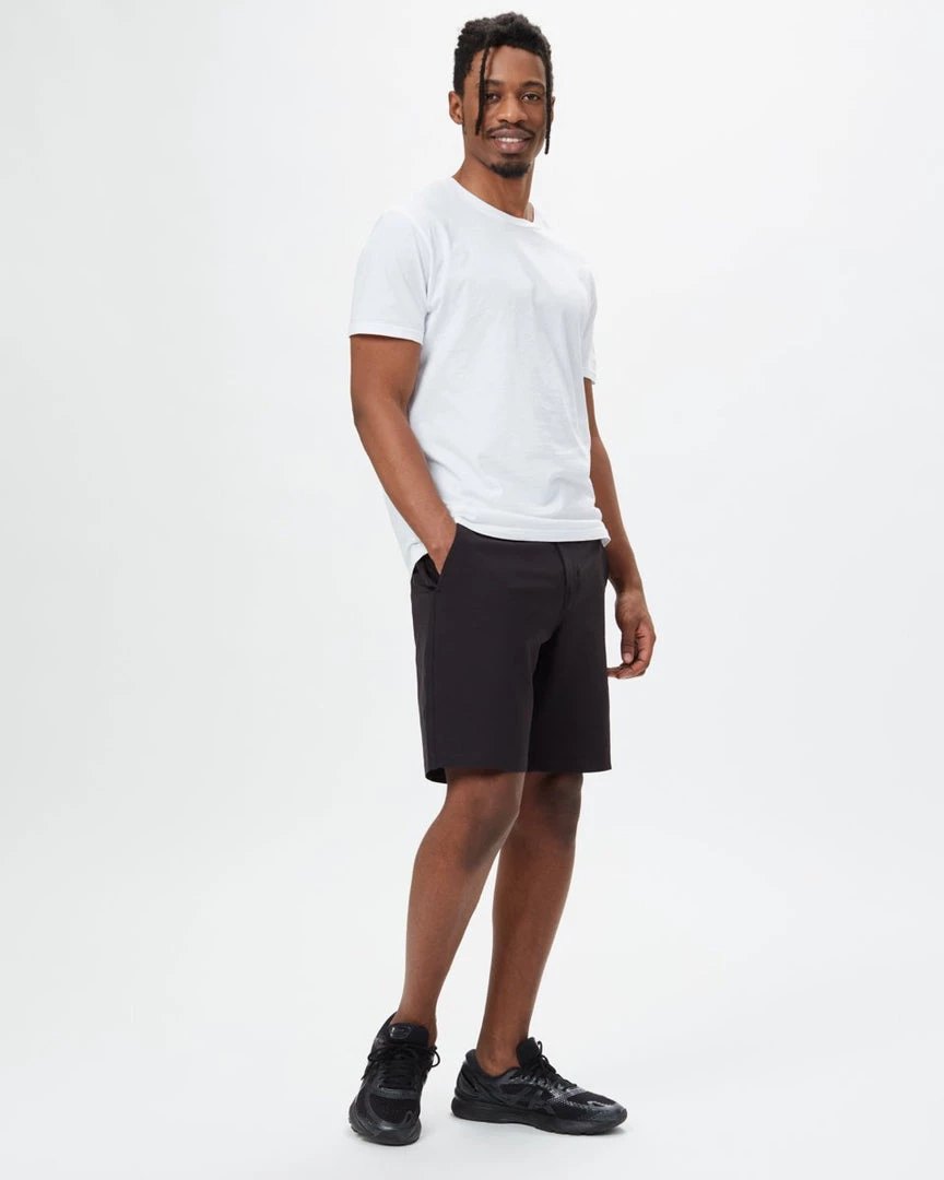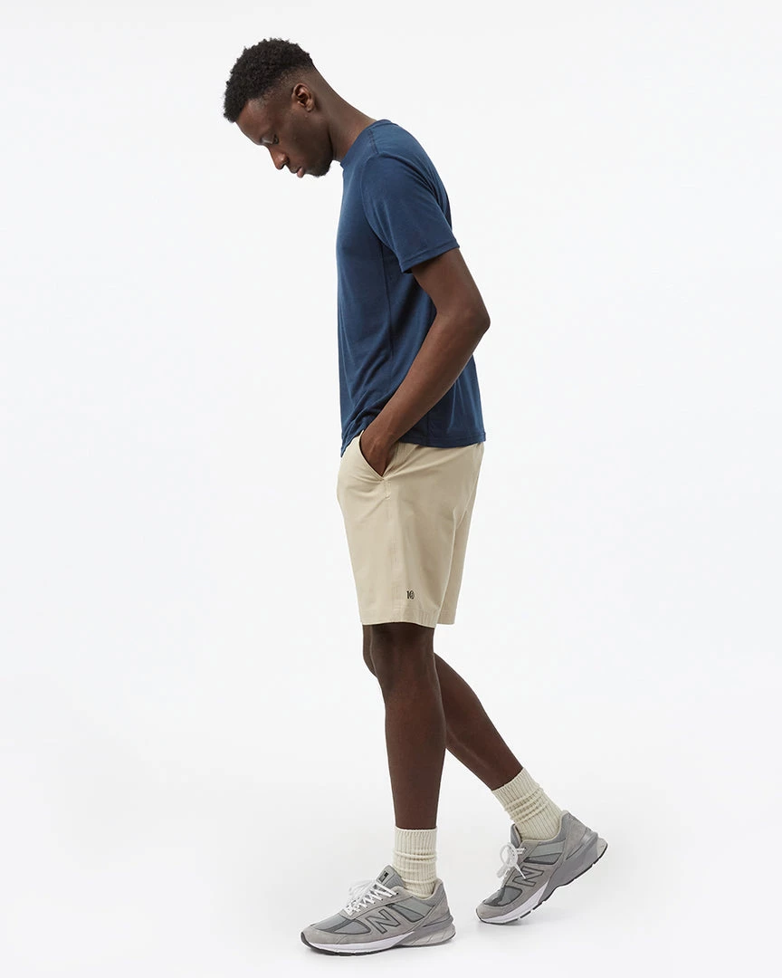 - Fixed waist shorts, front zip coin pocket, back belt pockets, 9” inseam