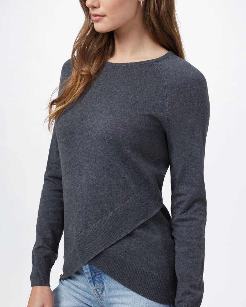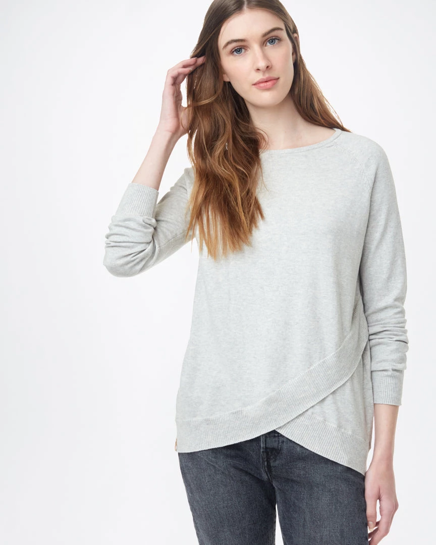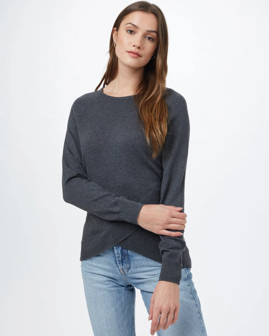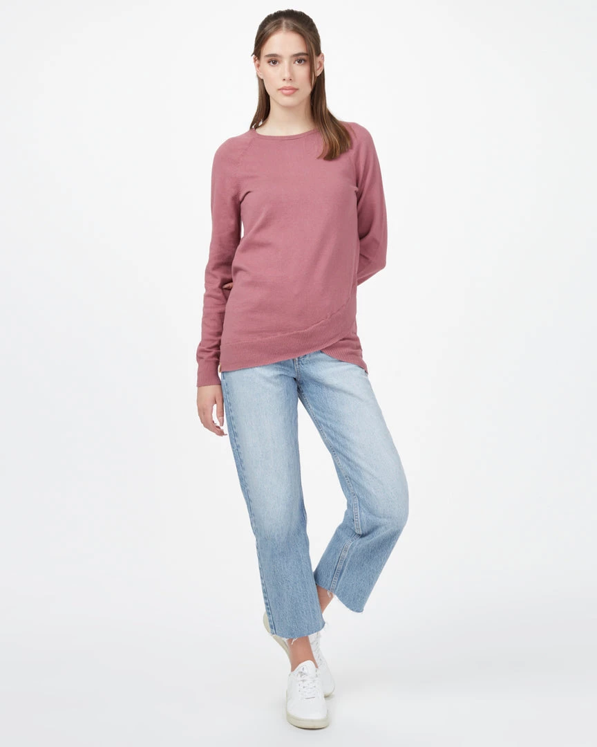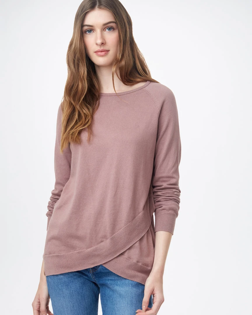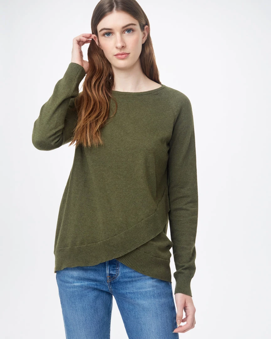 - Long sleeve raglan sweater, asymmetrical cross body front, ribbed cuffs and hem