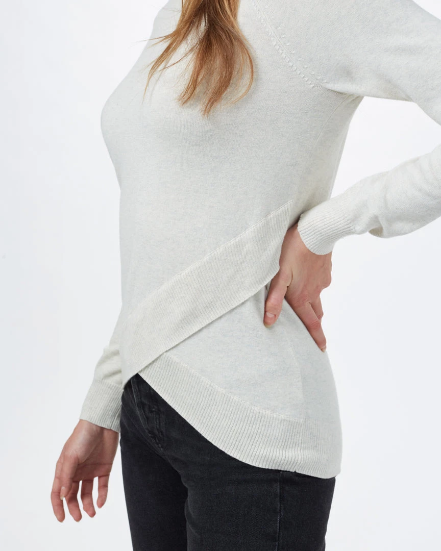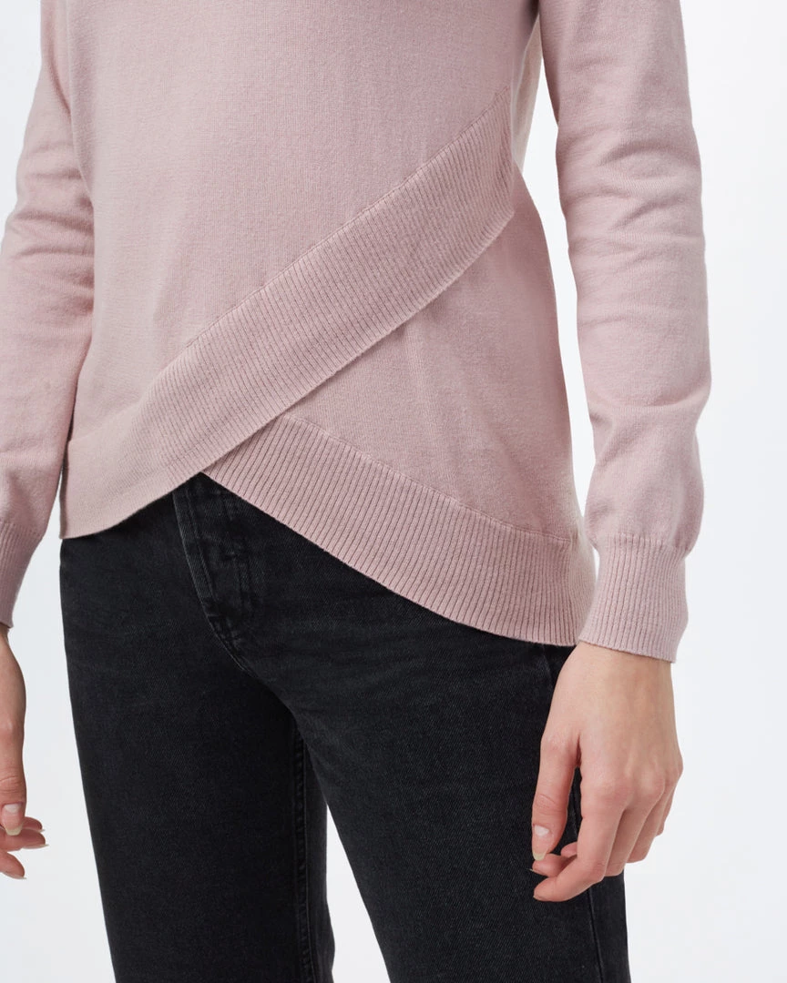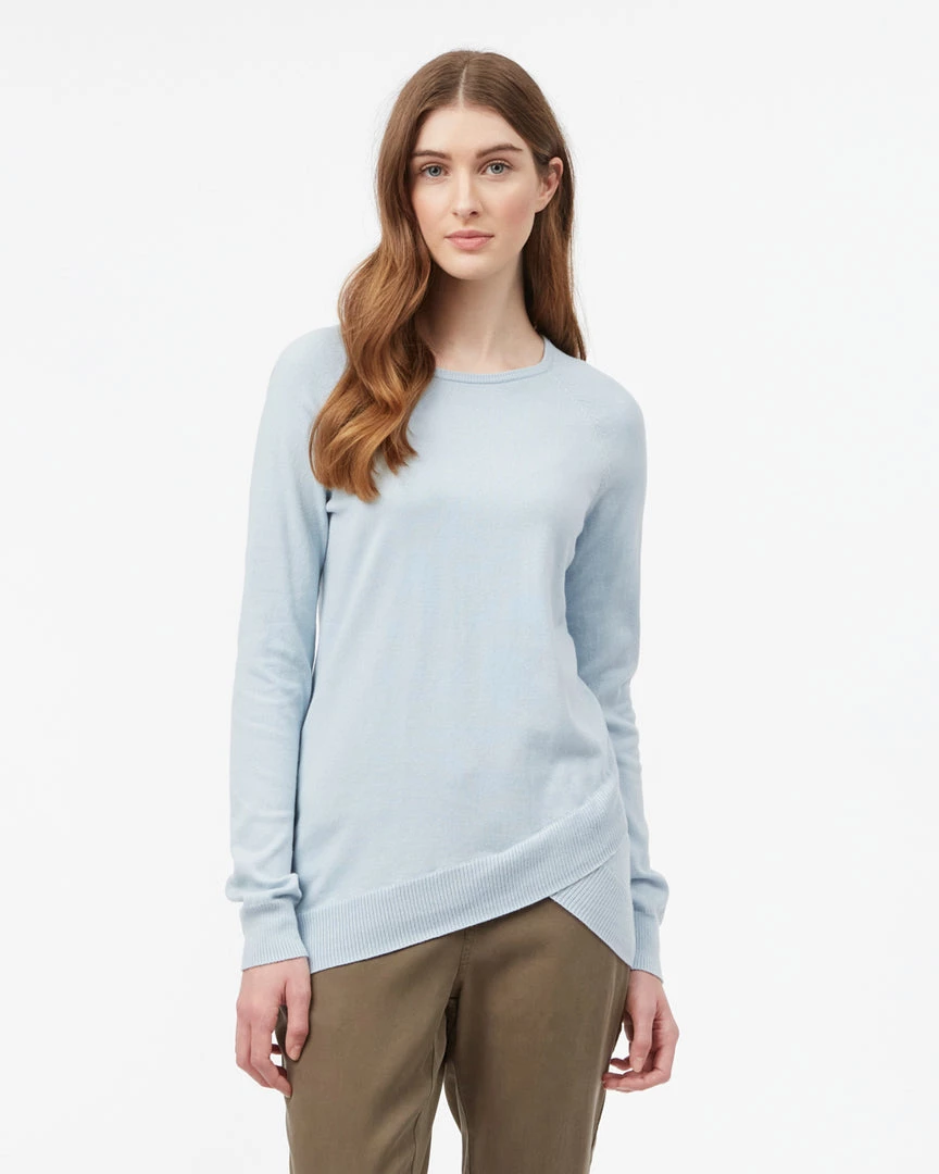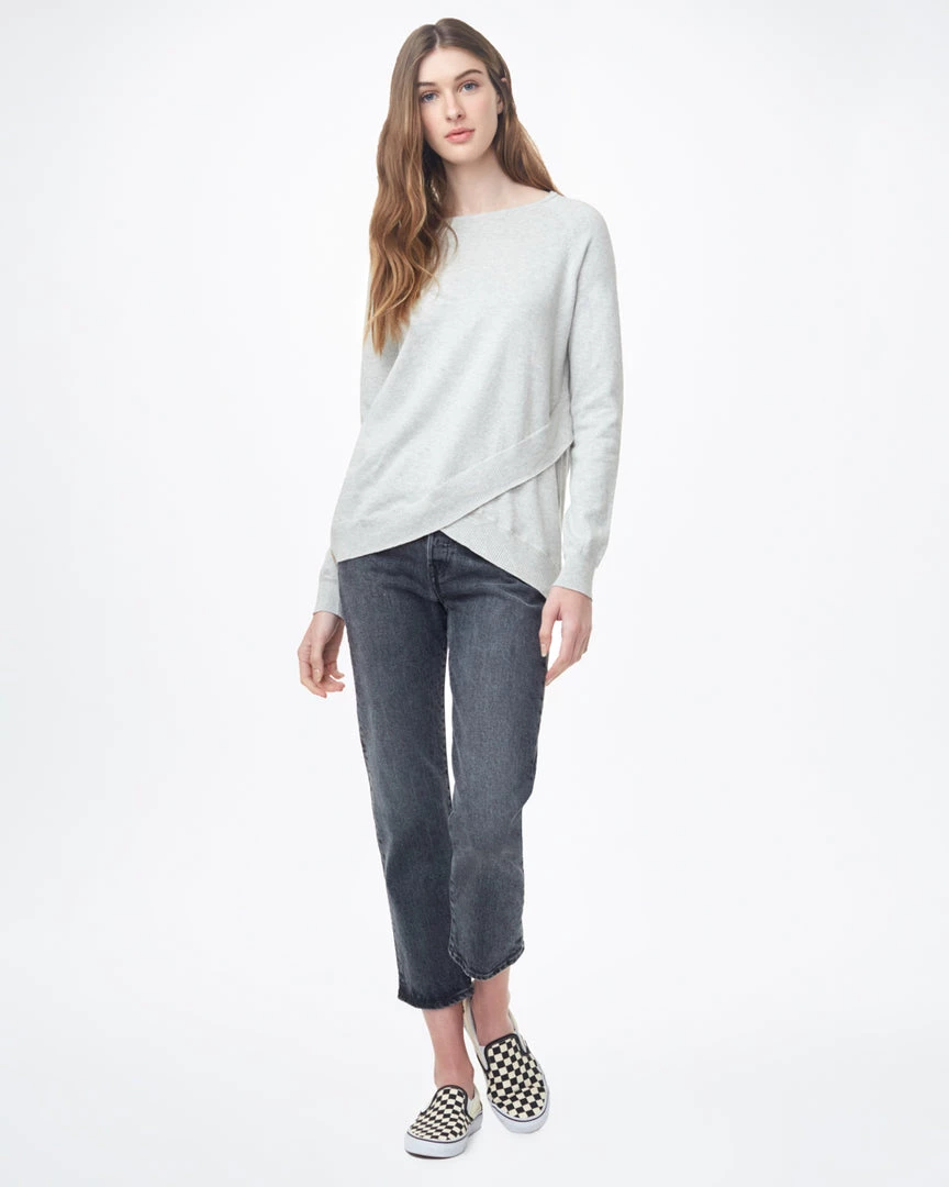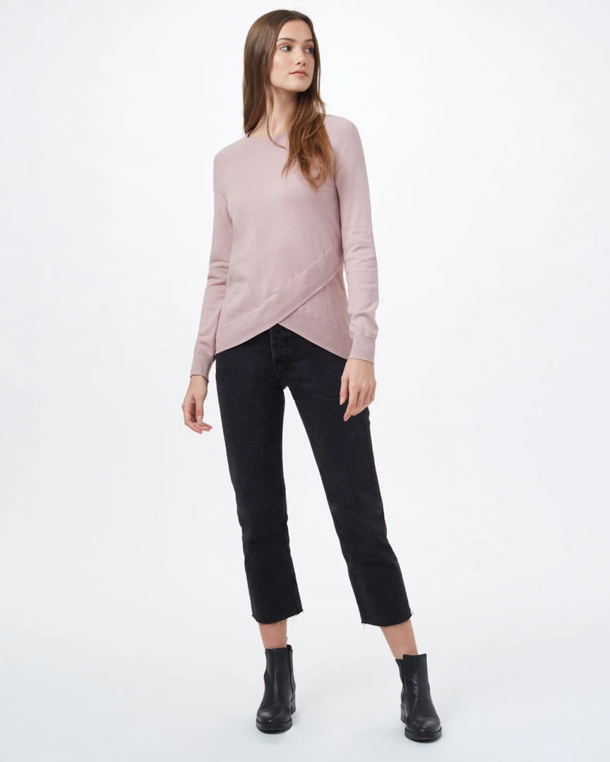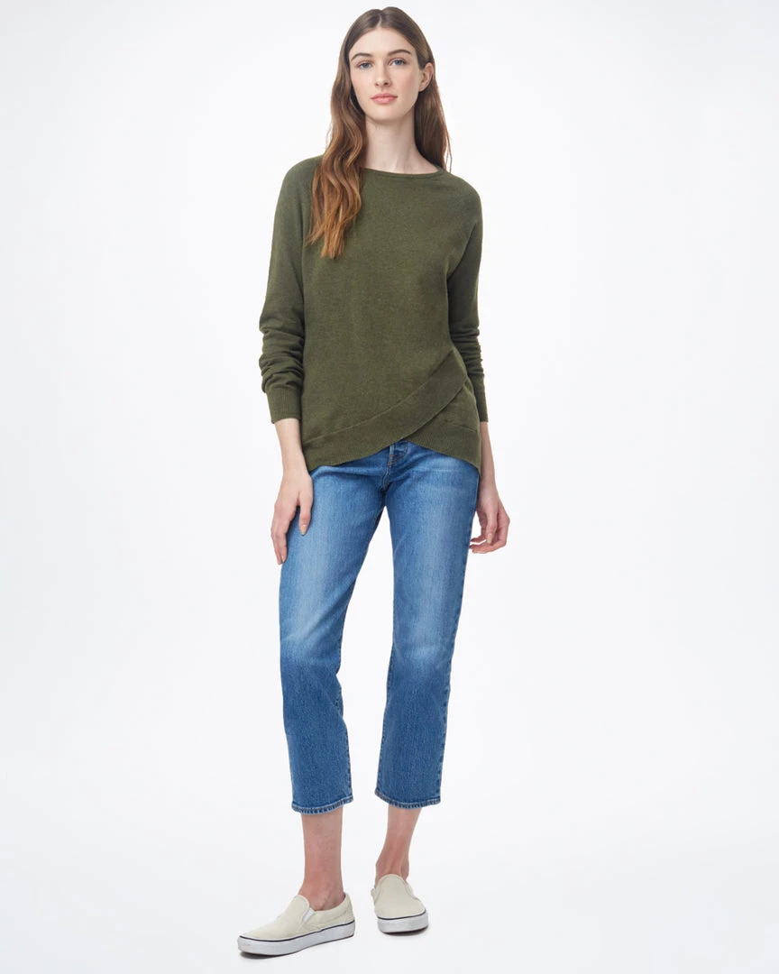 - Long sleeve raglan sweater, asymmetrical cross body front, ribbed cuffs and hem