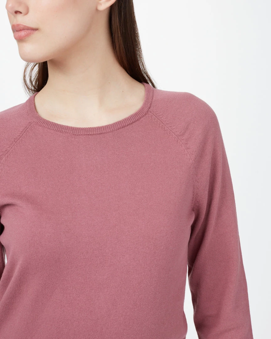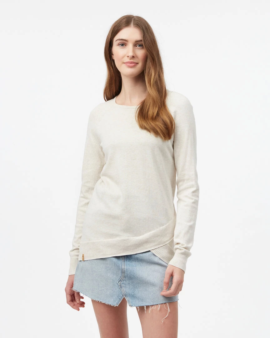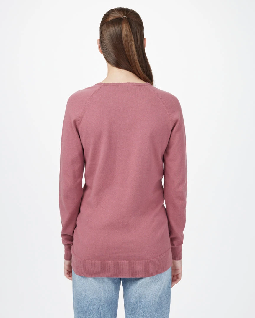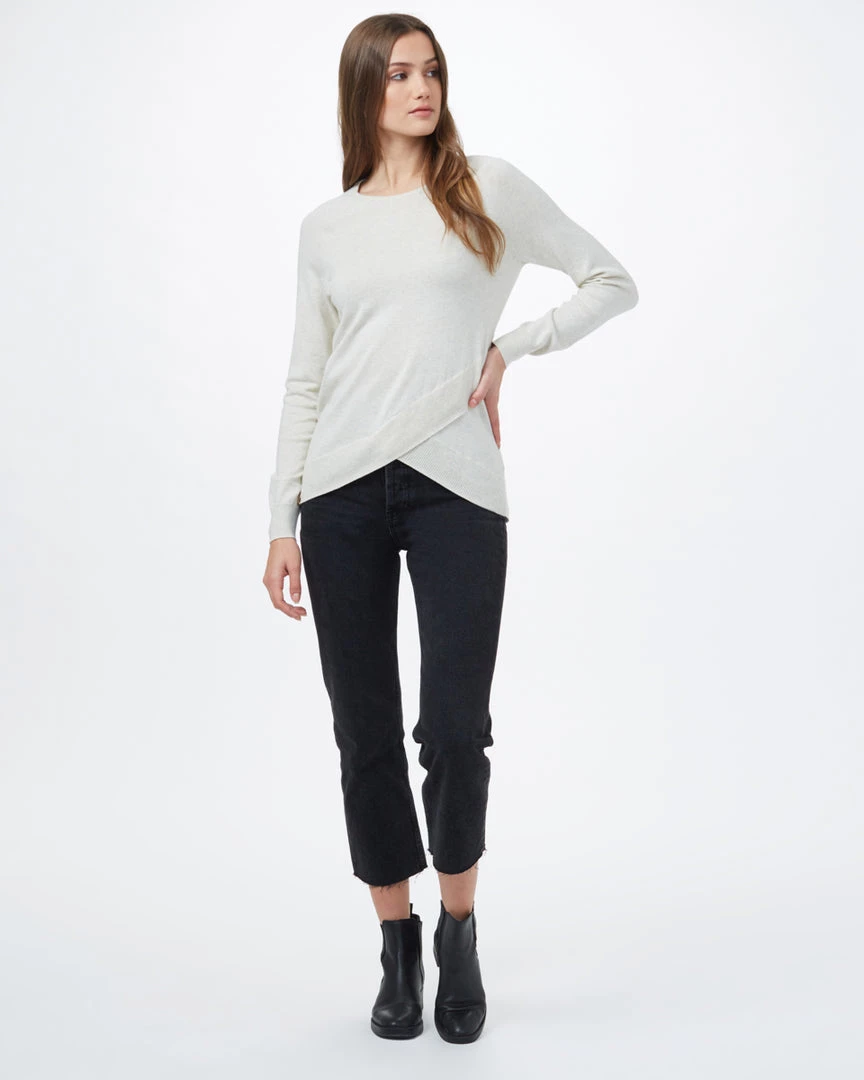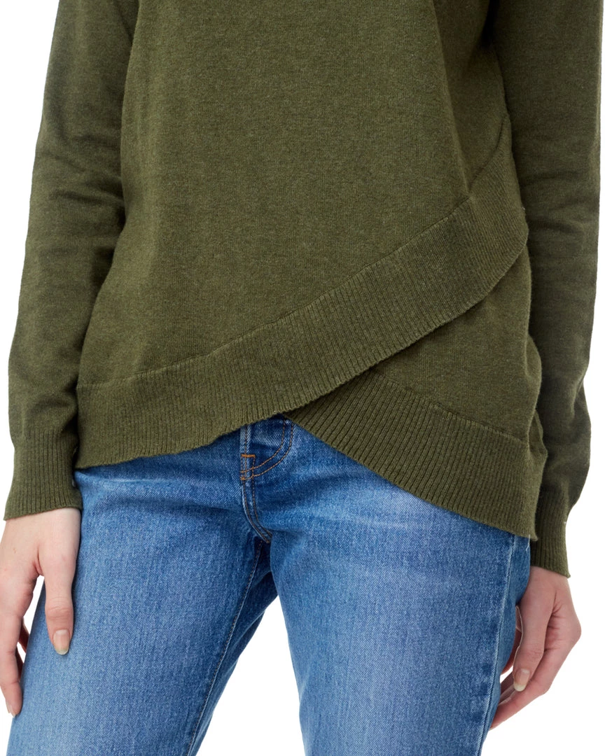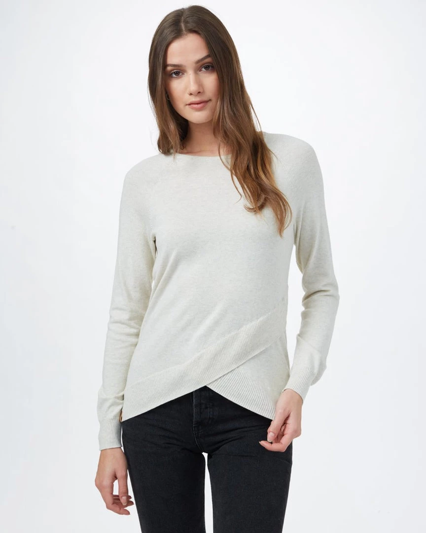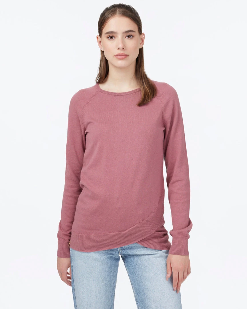 - Long sleeve raglan sweater, asymmetrical cross body front, ribbed cuffs and hem
