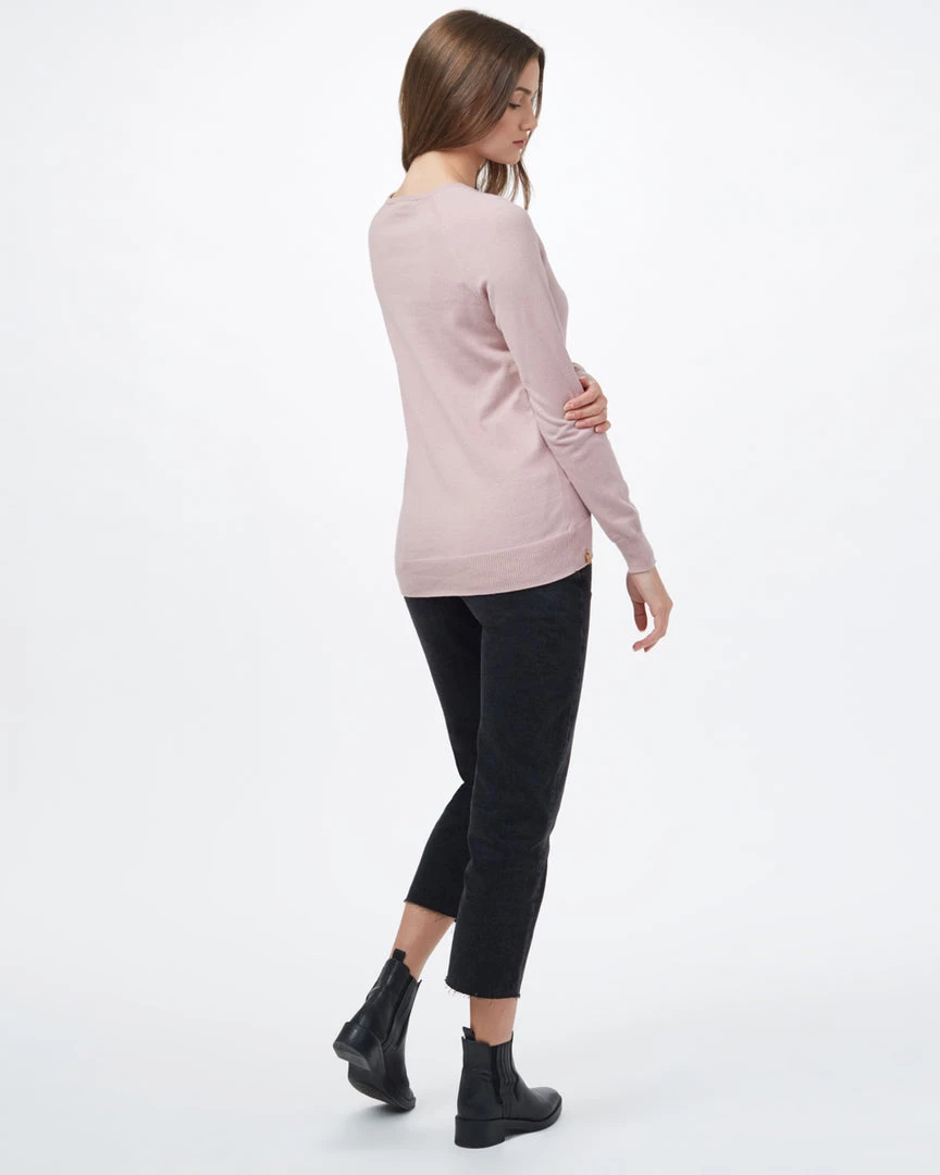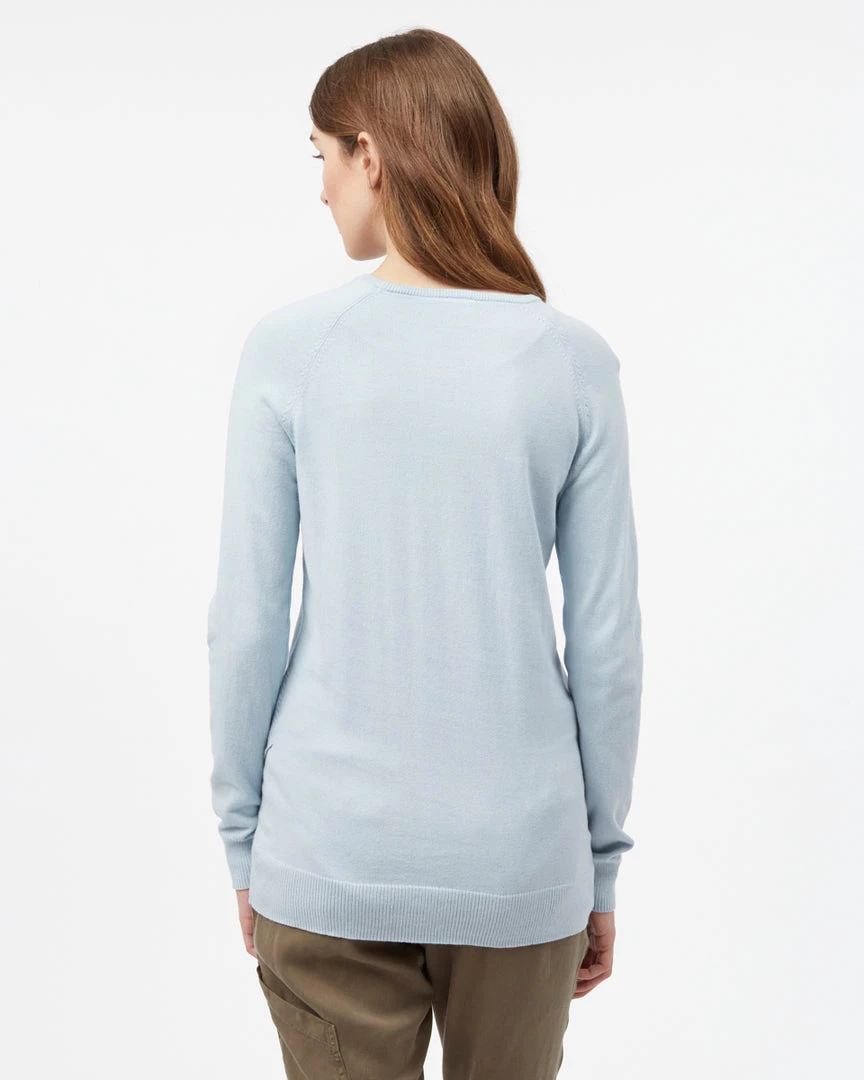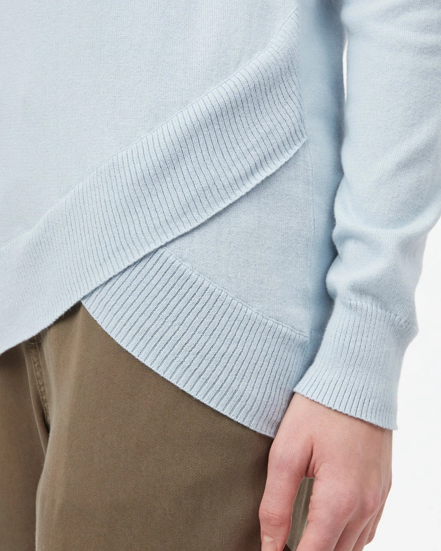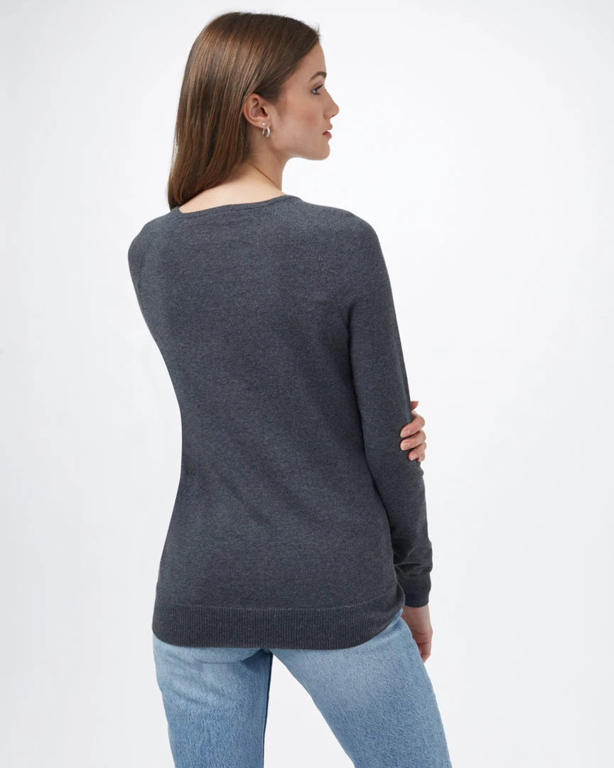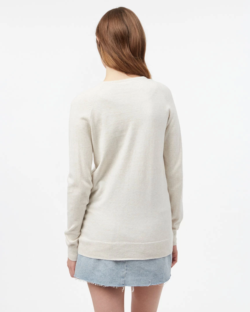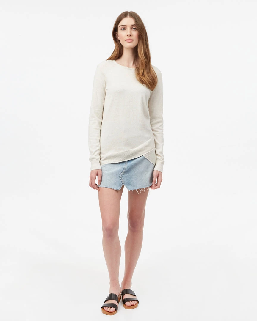 - Long sleeve raglan sweater, asymmetrical cross body front, ribbed cuffs and hem