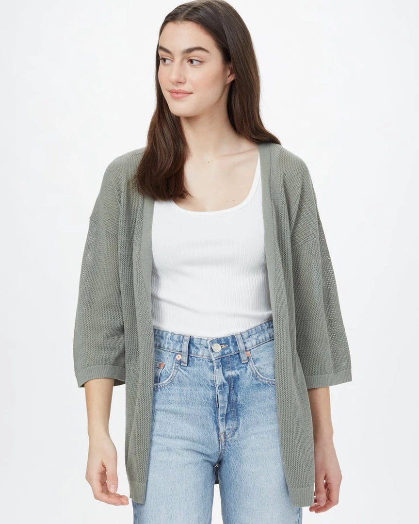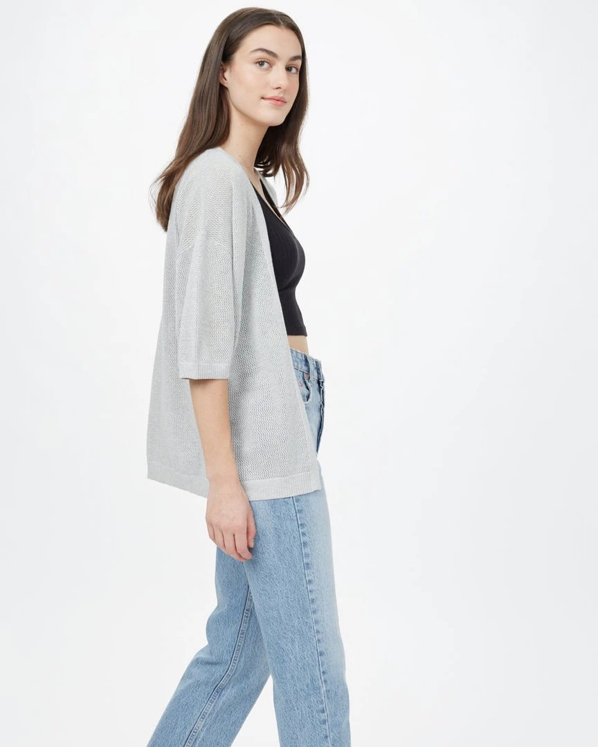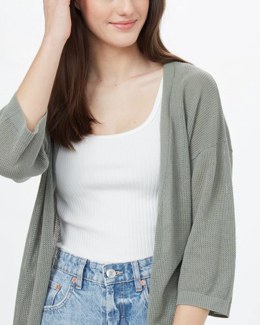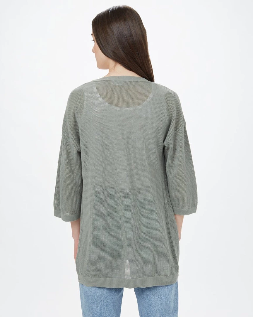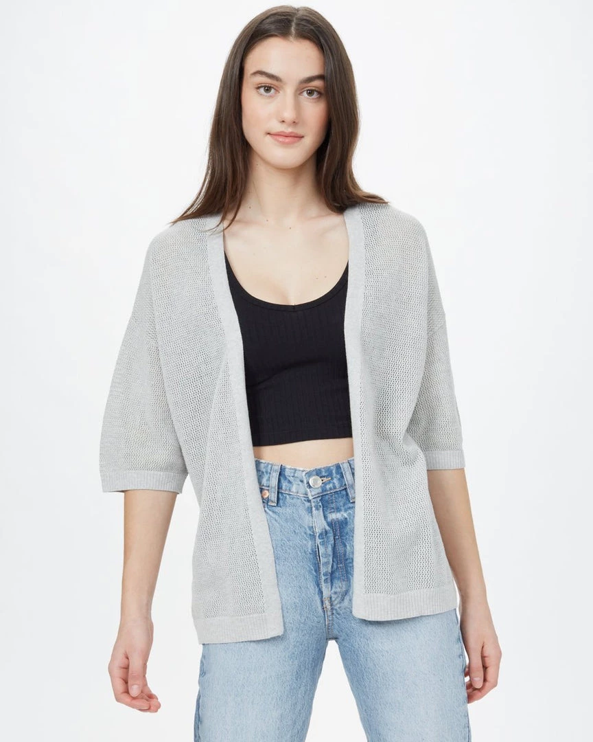 - Relaxed fit short sleeve cardigan, jersey & pointelle stitch, no front closure, 14 gauge