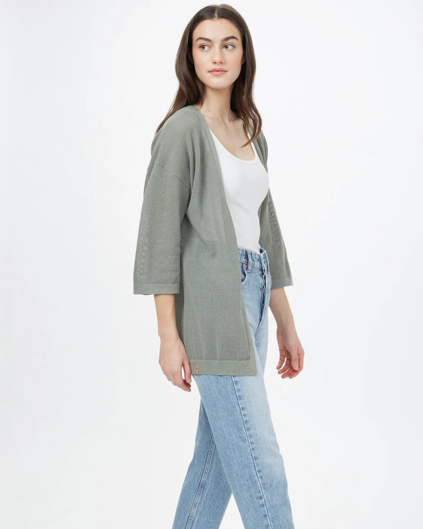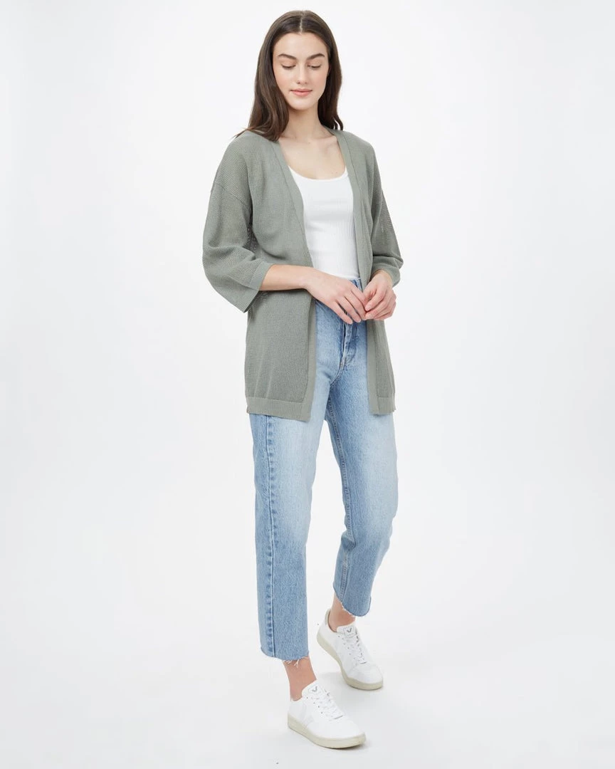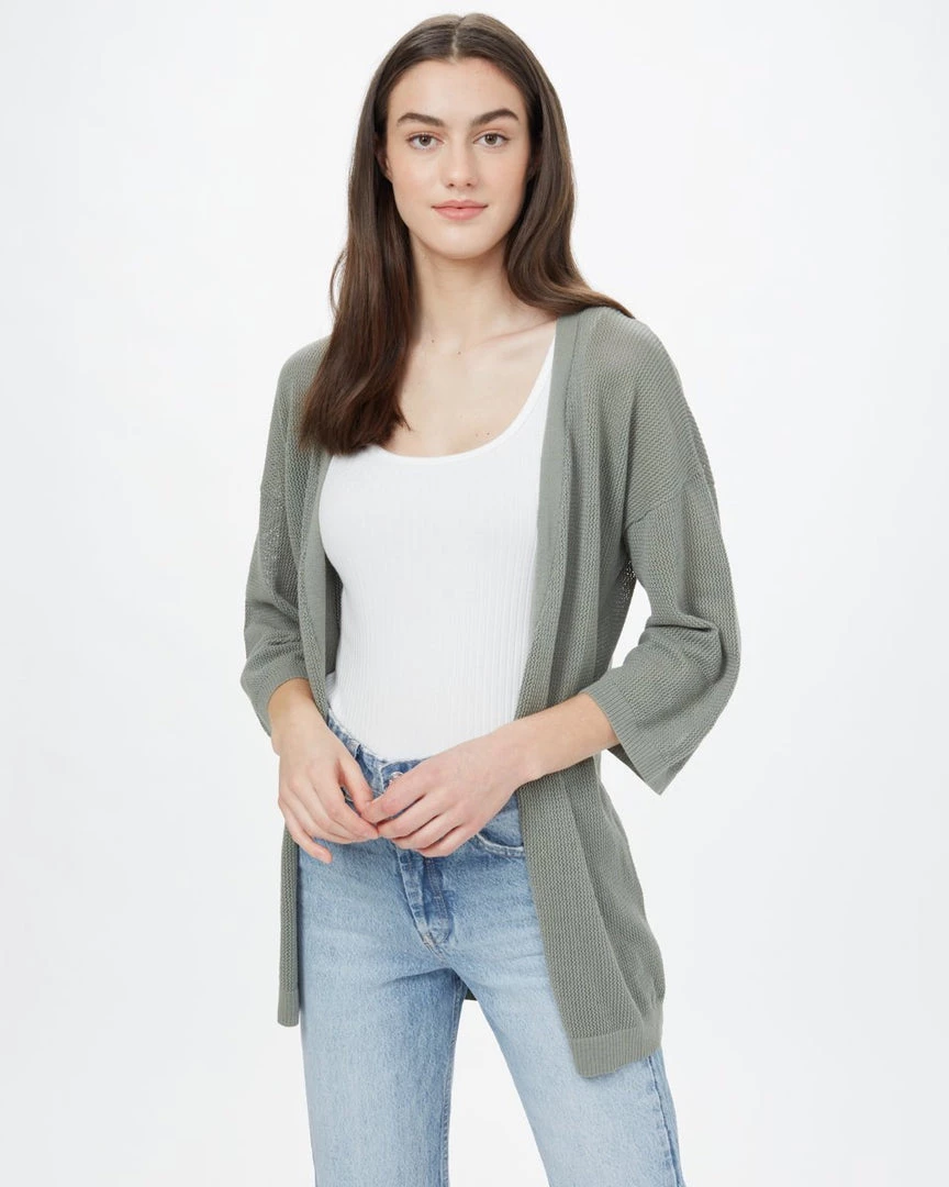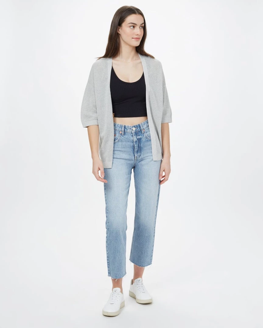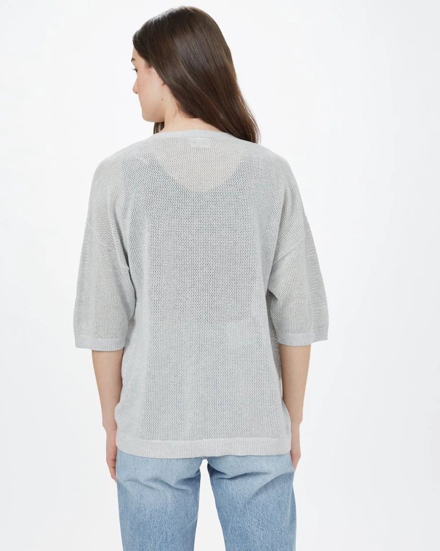 - Relaxed fit short sleeve cardigan, jersey & pointelle stitch, no front closure, 14 gauge