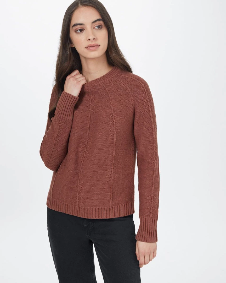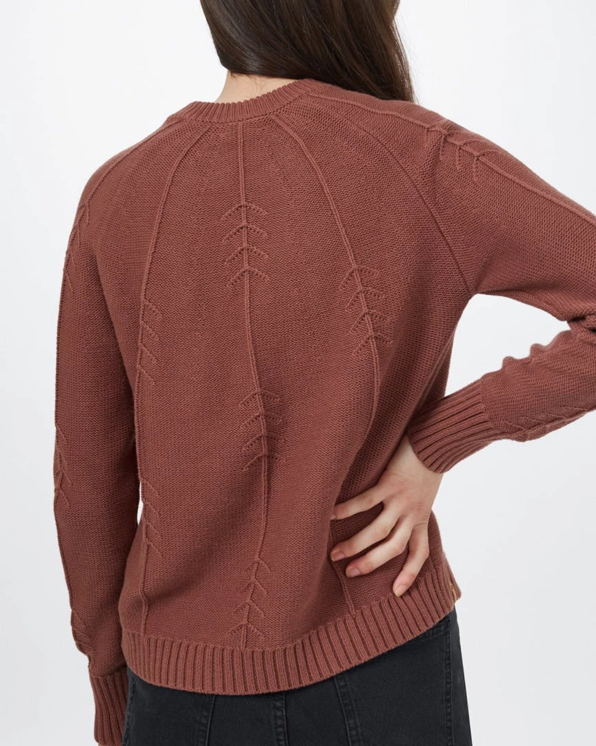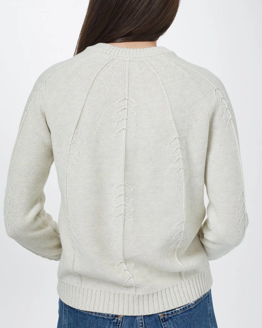 - Long sleeve crewneck knit sweater, thick ribbed neck and cuffs, treestitch detail
