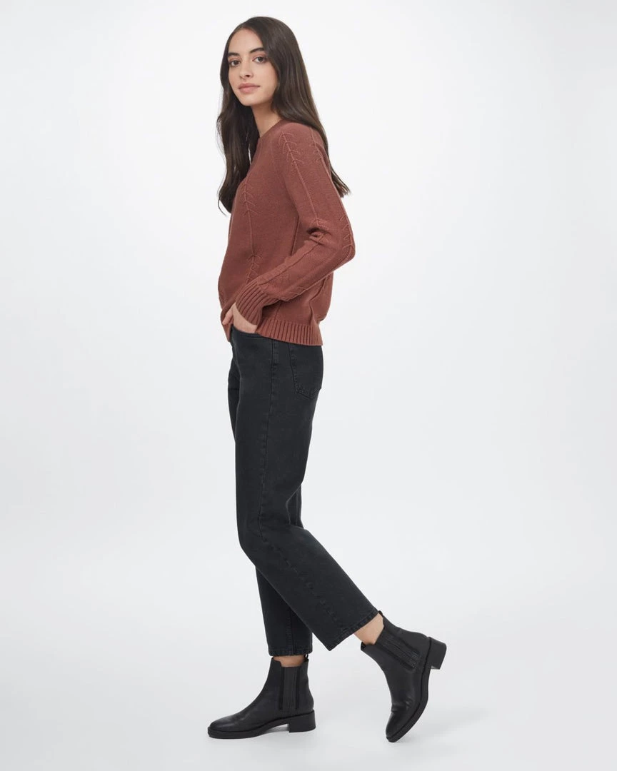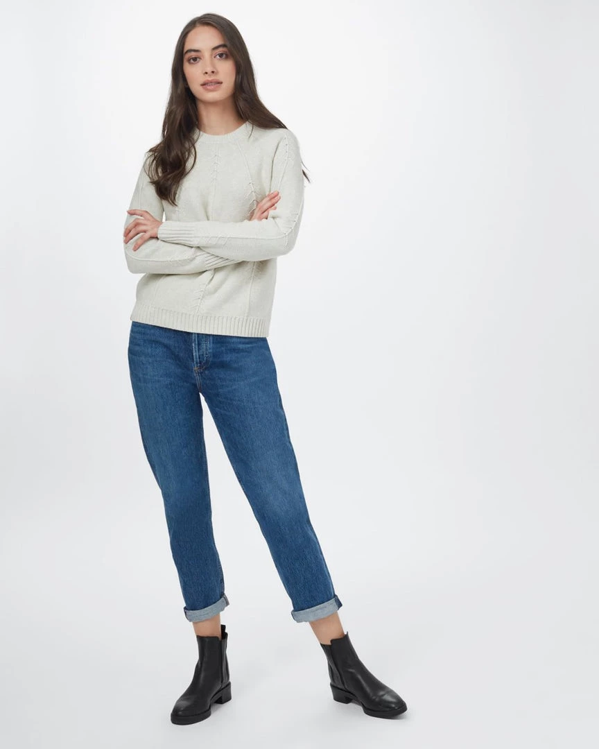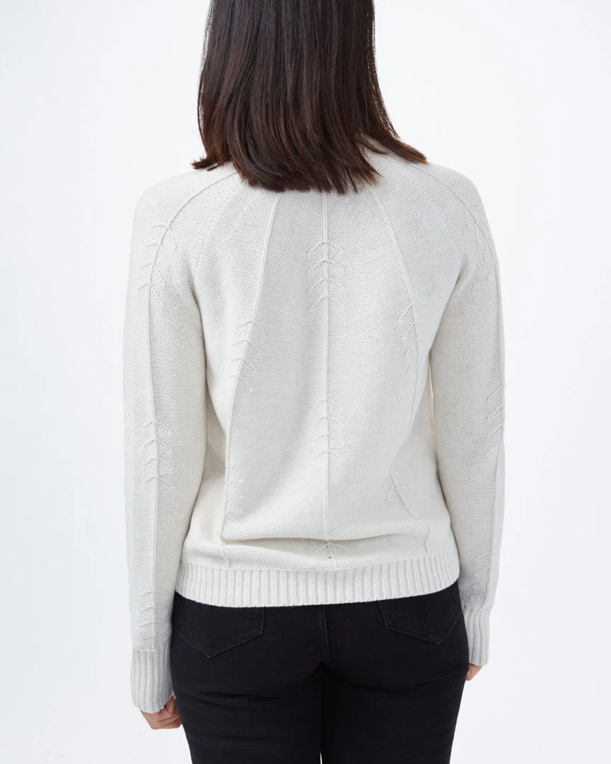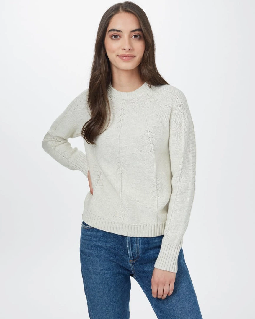 - Long sleeve crewneck knit sweater, thick ribbed neck and cuffs, treestitch detail
