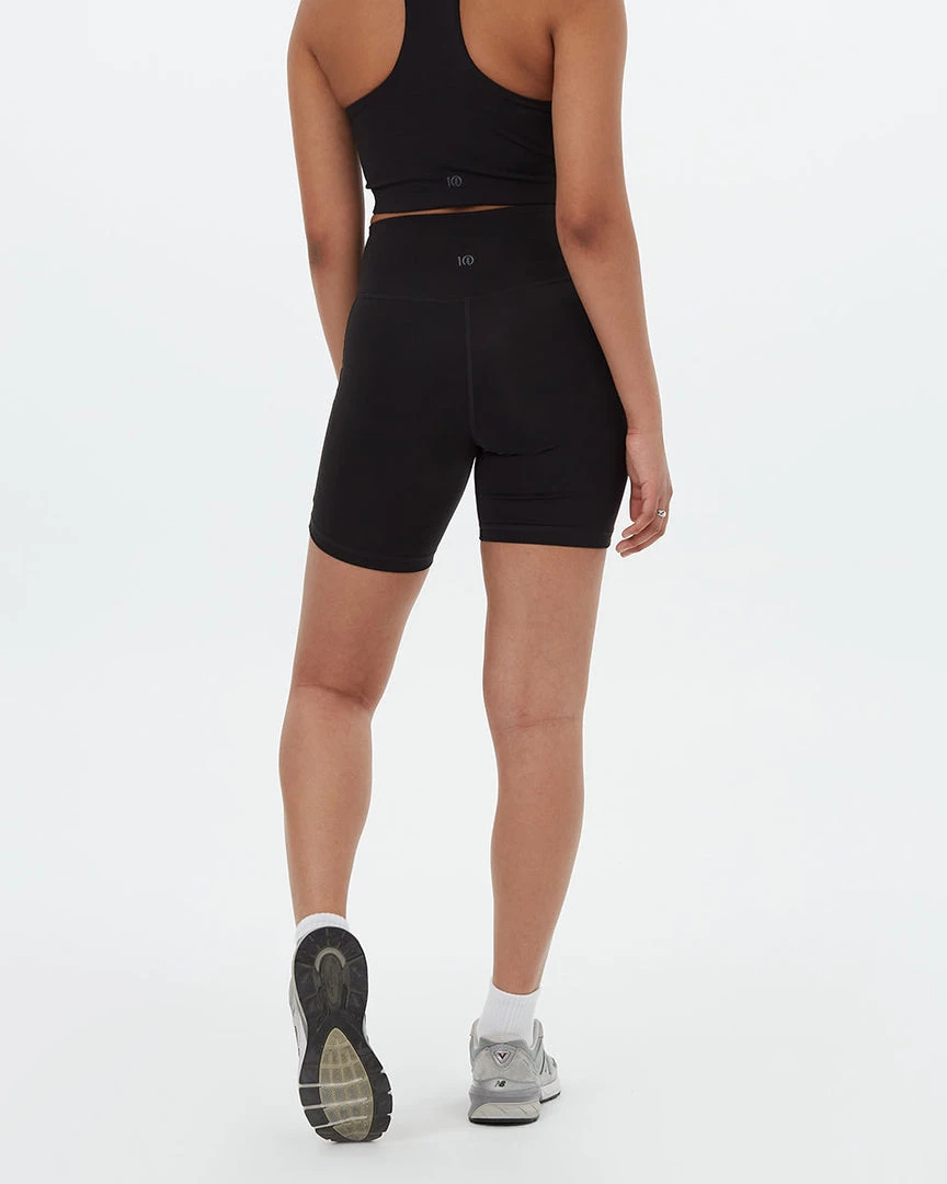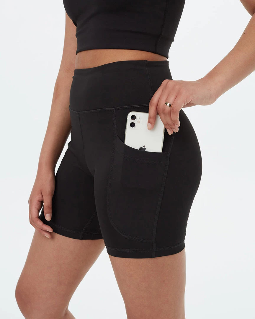 - Slim fit, high rise, high stretch, active bike short with 2 hidden waistband pockets and side pockets. High stretch fabric