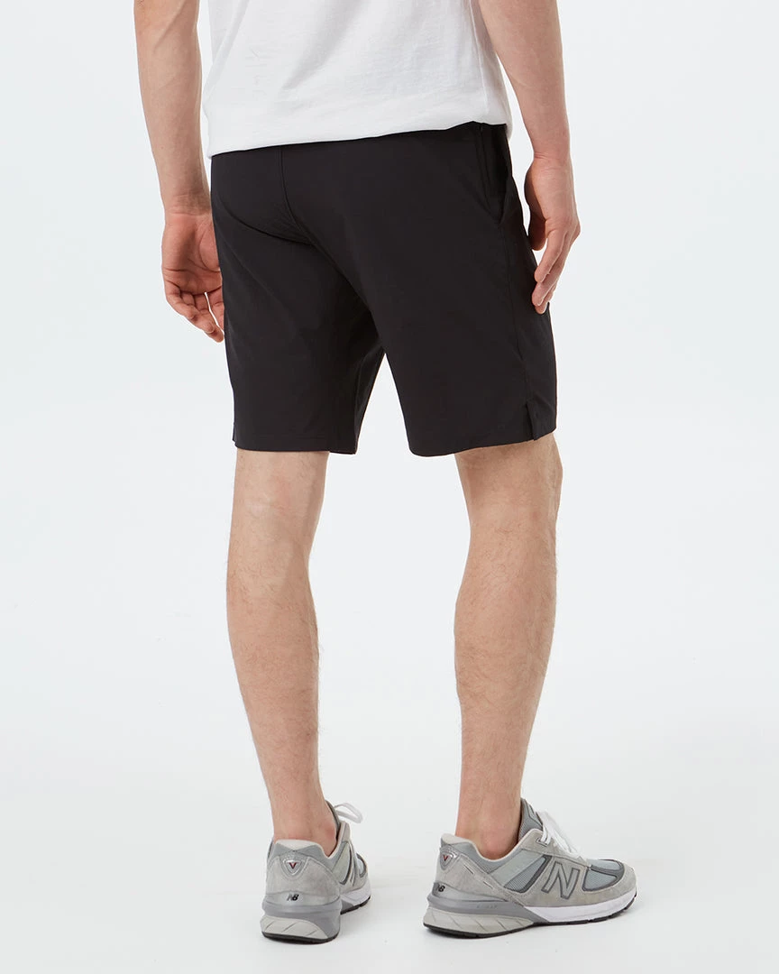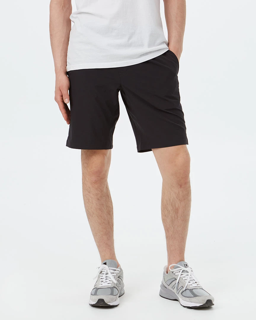 - Pull-on shorts, elastic waistband with drawcord, faux fly front, front zip coin pocket, hem side slits, 10” inseam