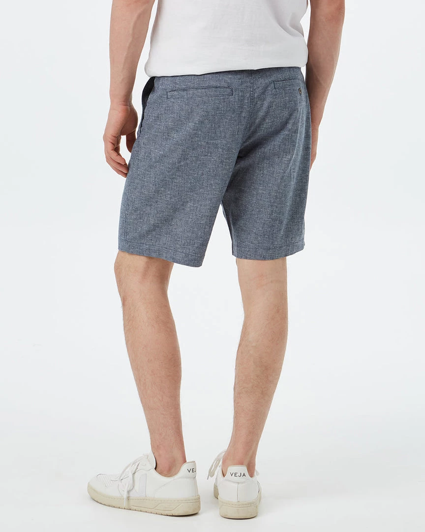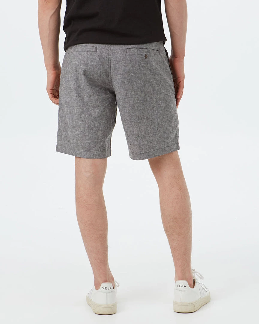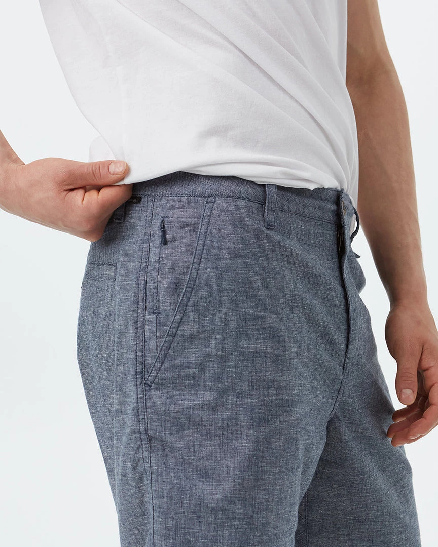 - Regular fit low stretched fixed waist short with 100% coconut button front, front hand pockets, front zip coin pocket and back welt pockets. Low stretch woven fabric