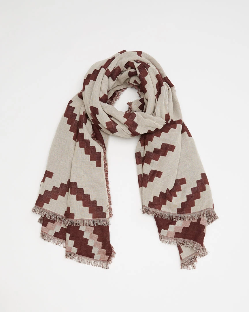 - Woven blanket scarf, Fringed edges, Double knit jacquard, Measures 66″ x 45″