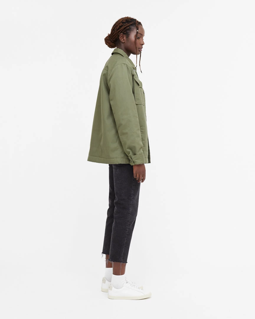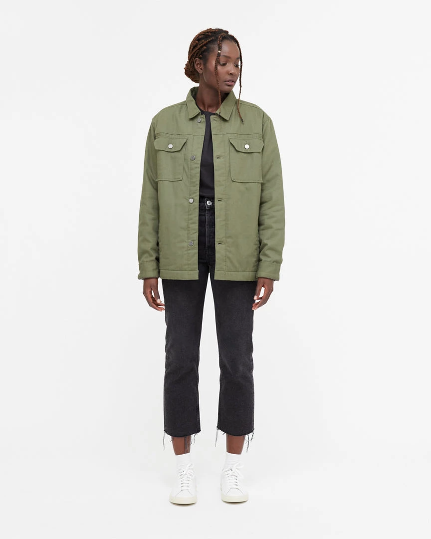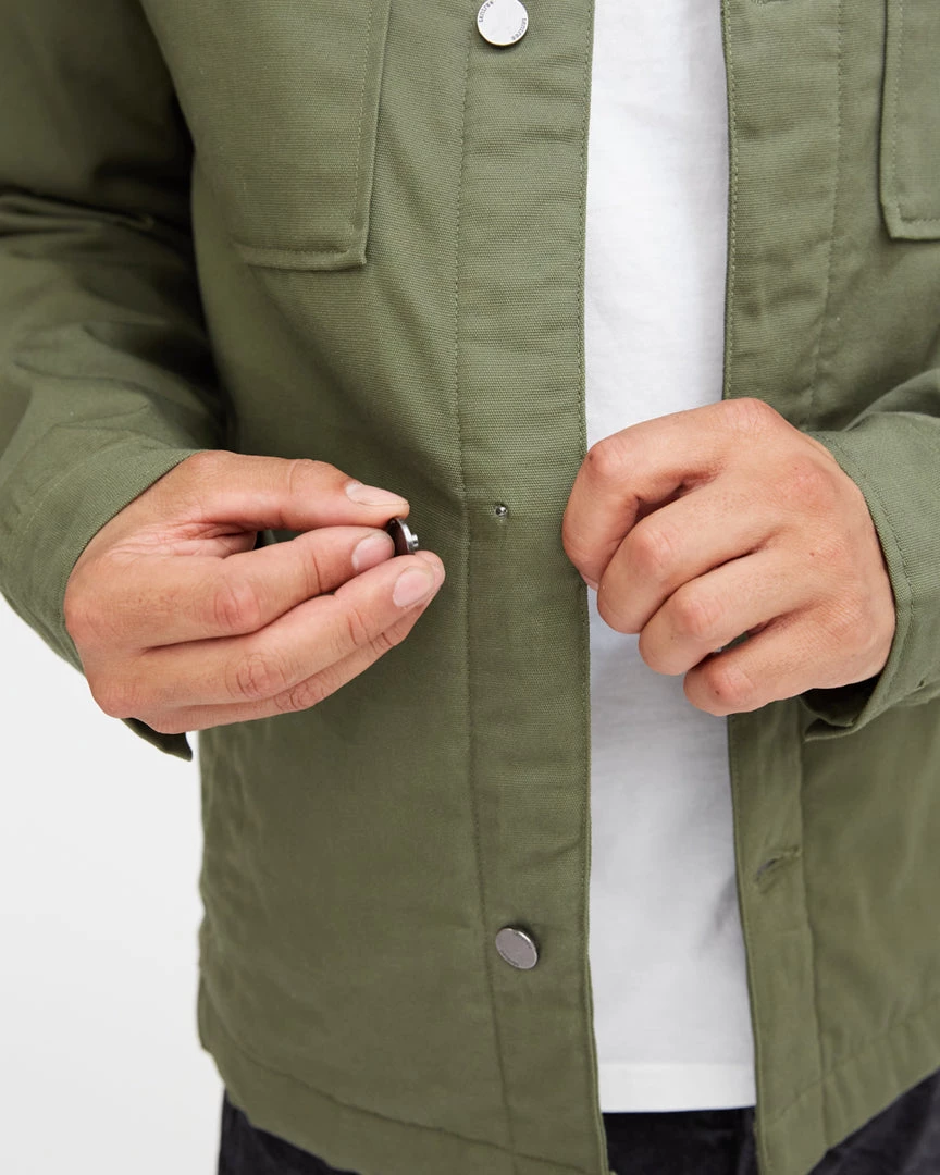 - Fully lined with insulated body and compostable once trims are removed. Screw-on removable shanks at front placket and cuff, no-minimal stretch.