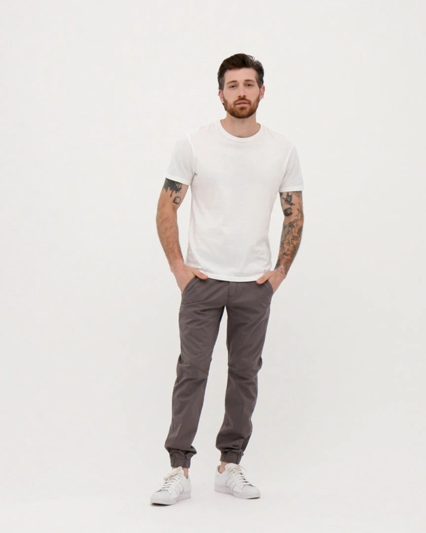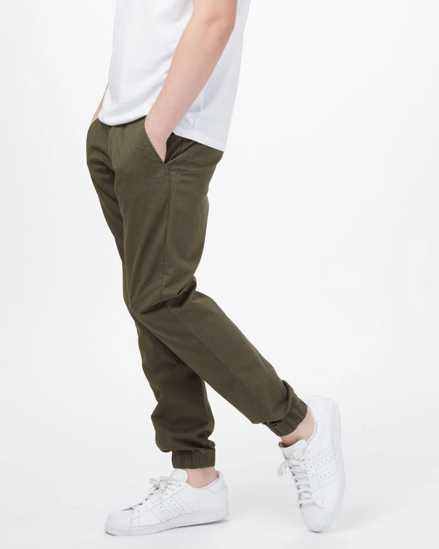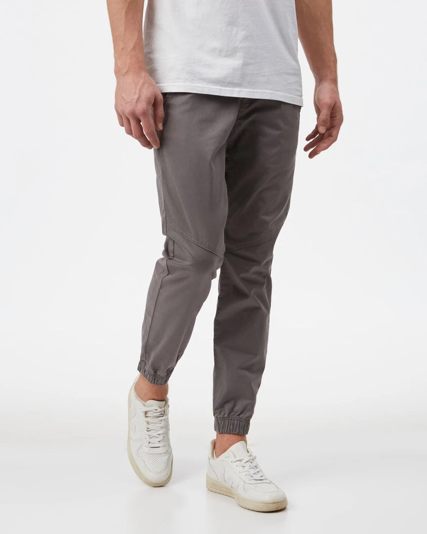 - Regular fit slim leg fixed waist jogger with elastic cuffs. Interior waist drawcord with zippered back left pocket and 30″ inseam (31″ on XL and XXL). Low stretch woven fabric.