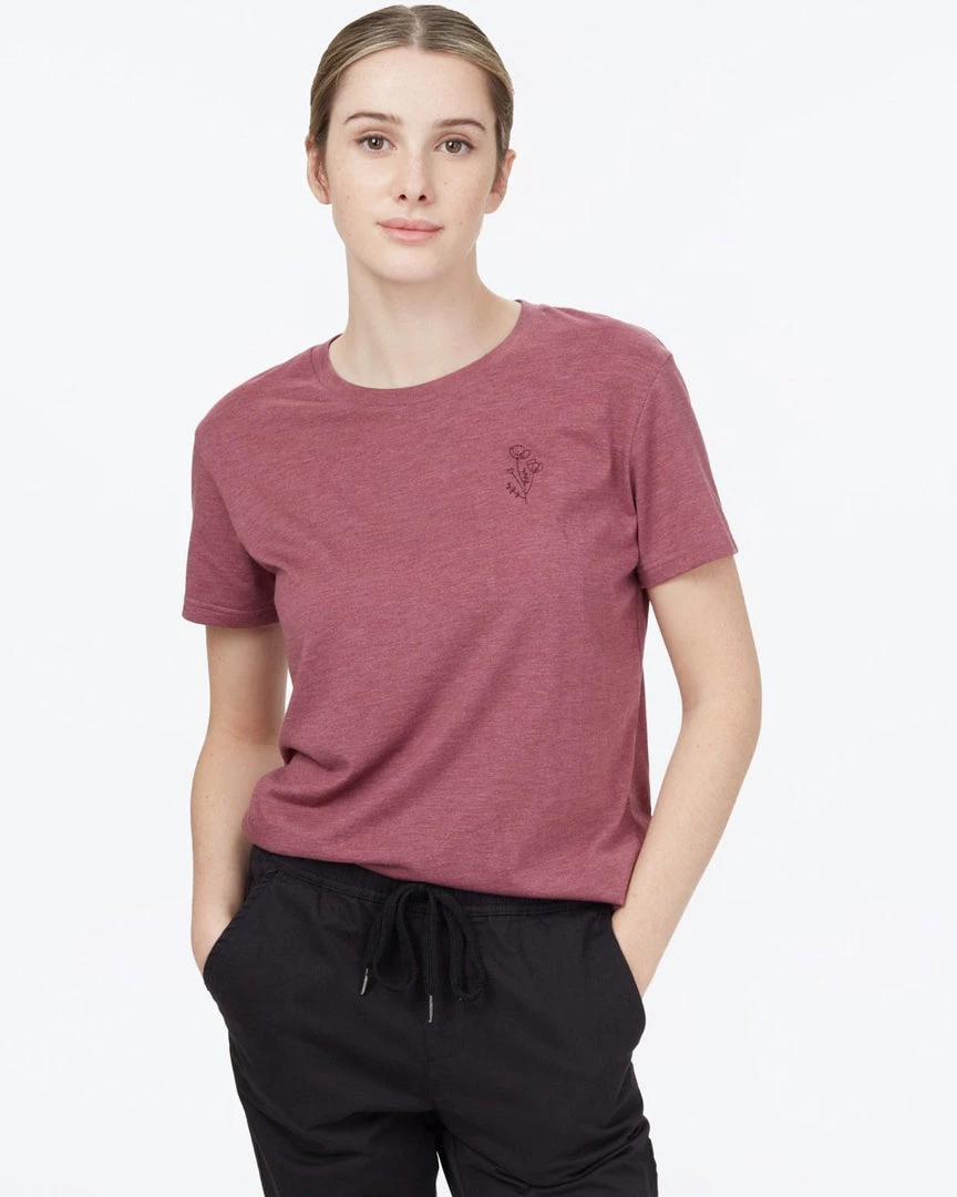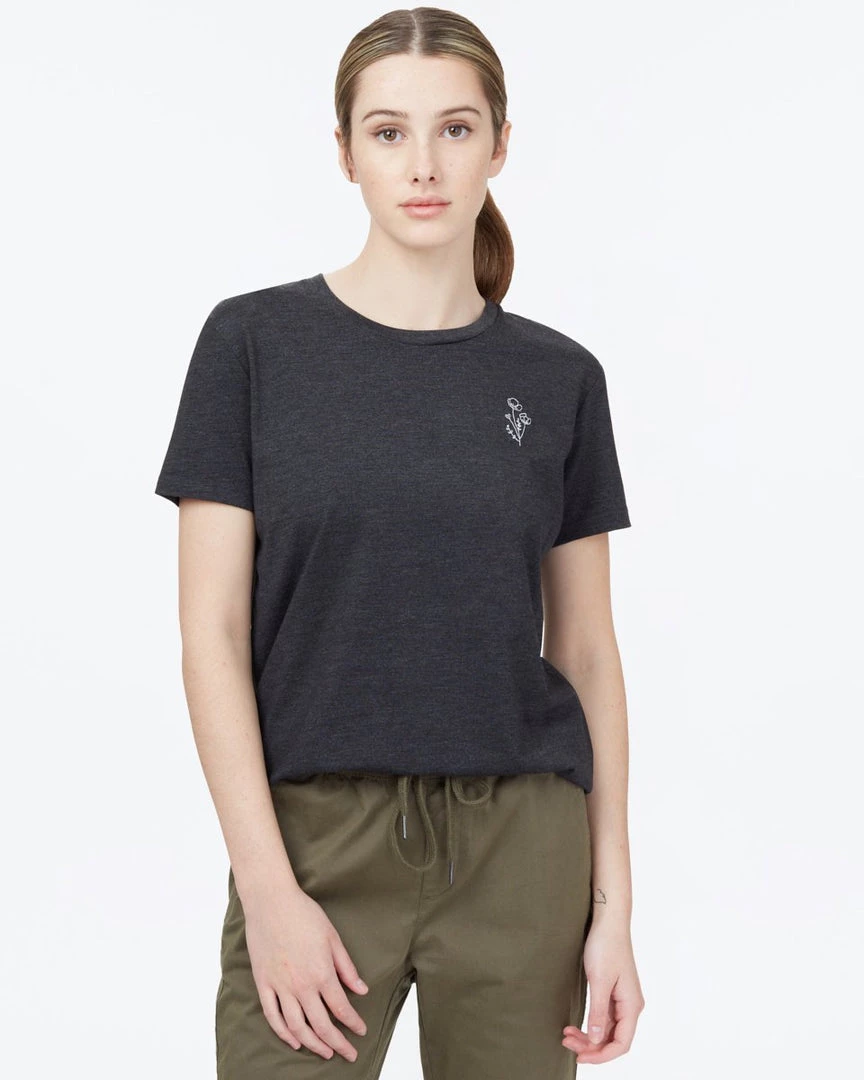 - Relaxed fit crew neck t-shirt with ribbed neck band and TENCEL™ medium stretch fabric. Embroidered “wildflower” design on chest. Medium stretch fabric